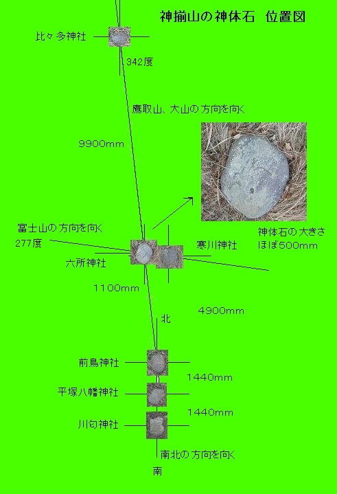 配置順 手前から三石は、川匂(かわわ)神社、前鳥(さきとり)神社です。 真ん中の二石は右から、寒川神社、六所神社です。遠くの一石は比々多神社です。 三石は、南北に並んでいます。二石は富士山の方向を向いています。一石はひとつなので 方向不明に見えますが、六所神社の一石には中心に穴があり、この穴から方向を見ると 鷹取山と大山の方向になります。不思議と思えるのは、神揃山からは鷹取山、大山が 直線上にあることです。カシミール3Dで検証すると342度で全く同一線上です。 配置の意味は、それぞれの神社の志向するところの、方向を示していると考えます。 三石の川匂神社、平塚八幡神社、前鳥神社は、南北を意識した神社。 二石の寒川神社、六所神社は、富士山を強く意識した神社。その理由として寒川神社は、 お彼岸の例大祭をもっとも大事な行事としており、その日に、ダイアモンド富士が神社で 見えます。 六所神社も櫛祭りの日にダイアモンド富士が、元あった石神台で見れます。 一石の比々多神社は、大山を意識した神社と思われます。 それぞれの、神体石の間隔の意味については、まだ、解釈できていません。 六所神社の神体石以外の5神体石は、実際の南にある神社の順に、川匂神社、 平塚八幡神社、前鳥神社、寒川神社、比々多神社と置かれています。 そこで六所神社の神体石が要石となって配置されていると思われます。