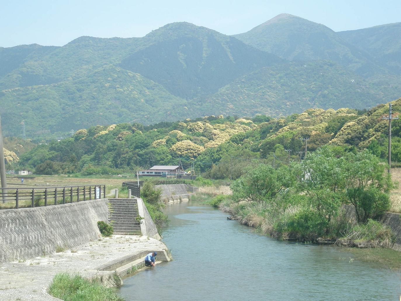 25 鷹取山(福岡県直方市大字永満寺付近) 正面の山です。右の高い山は福智山です。天草の高取山と対になって、筑紫平野の人たちが倭国連合した後に、本隊は直接この方向に向かったことを遺す意思表示に見えます。また、ここで左折して遠賀川を下ったことも遺したのであろう。下段は付近の遠賀川です。