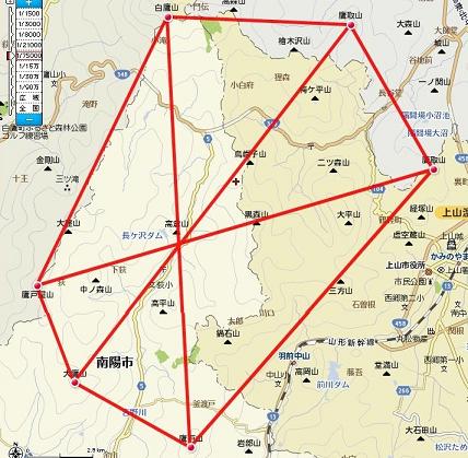 32 鷹取山(山形県山形市大字柏倉付近) 遠い洋野町の高取山と対をなして東征隊が北から南下したことを遺したものと思います。近くの富神山のほうが目立つが、この鷹取山も谷合にあるしっかりした山です。下段はこの付近にある六つの鷹山の分布図です。対山を結んだ中心が一点に集まり高倉山となる不思議があります。