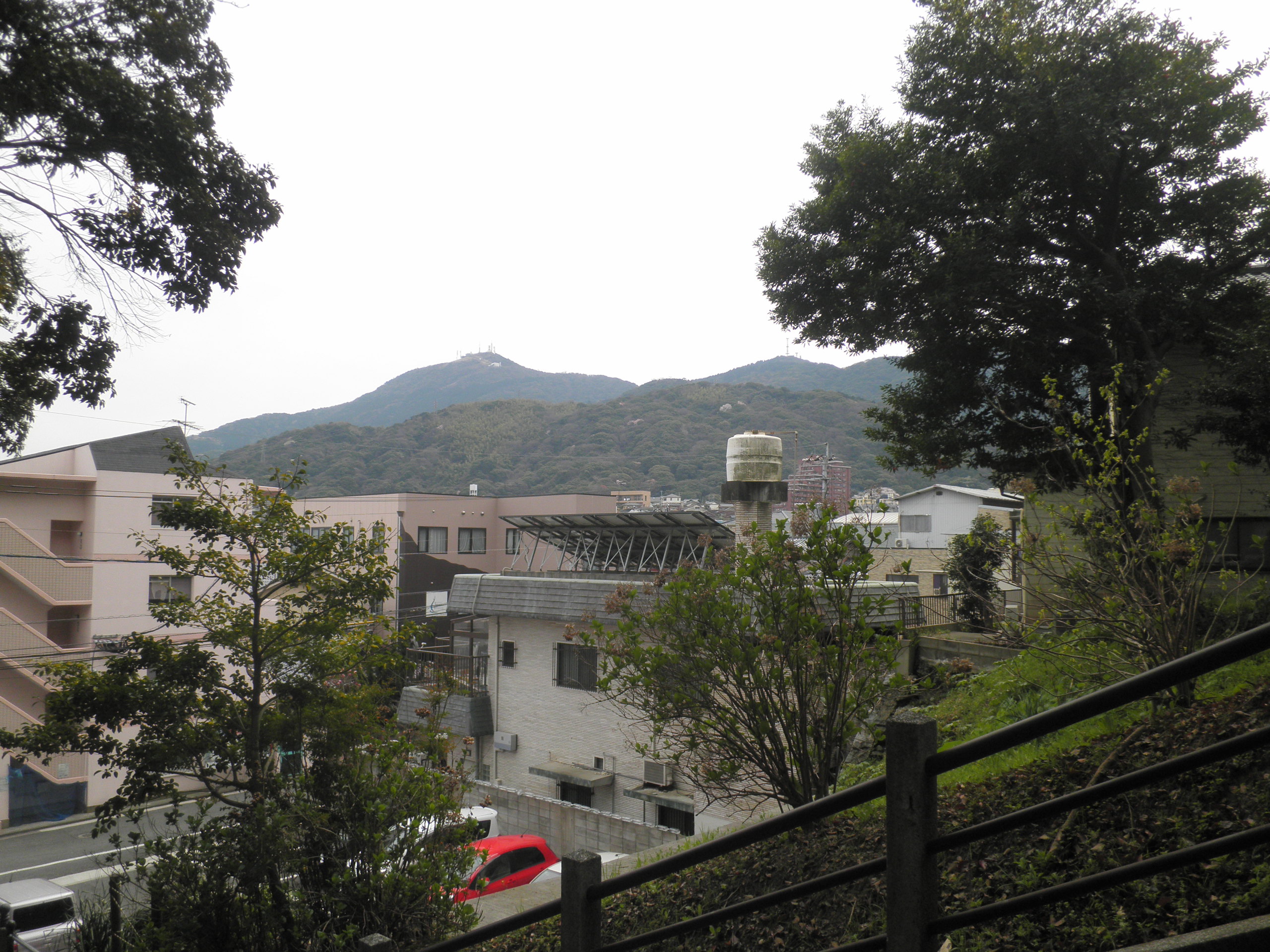 21 権現山 福岡県北九州市八幡西区 付近。古事記は神武が東征途次、岡田宮に留まったことを記します。画像は岡田宮石段から、花尾山を通して、権現山と皿倉山の鞍部に向って直線であることを示しています。権現山と皿倉山が同時の名づけであることが分かります。