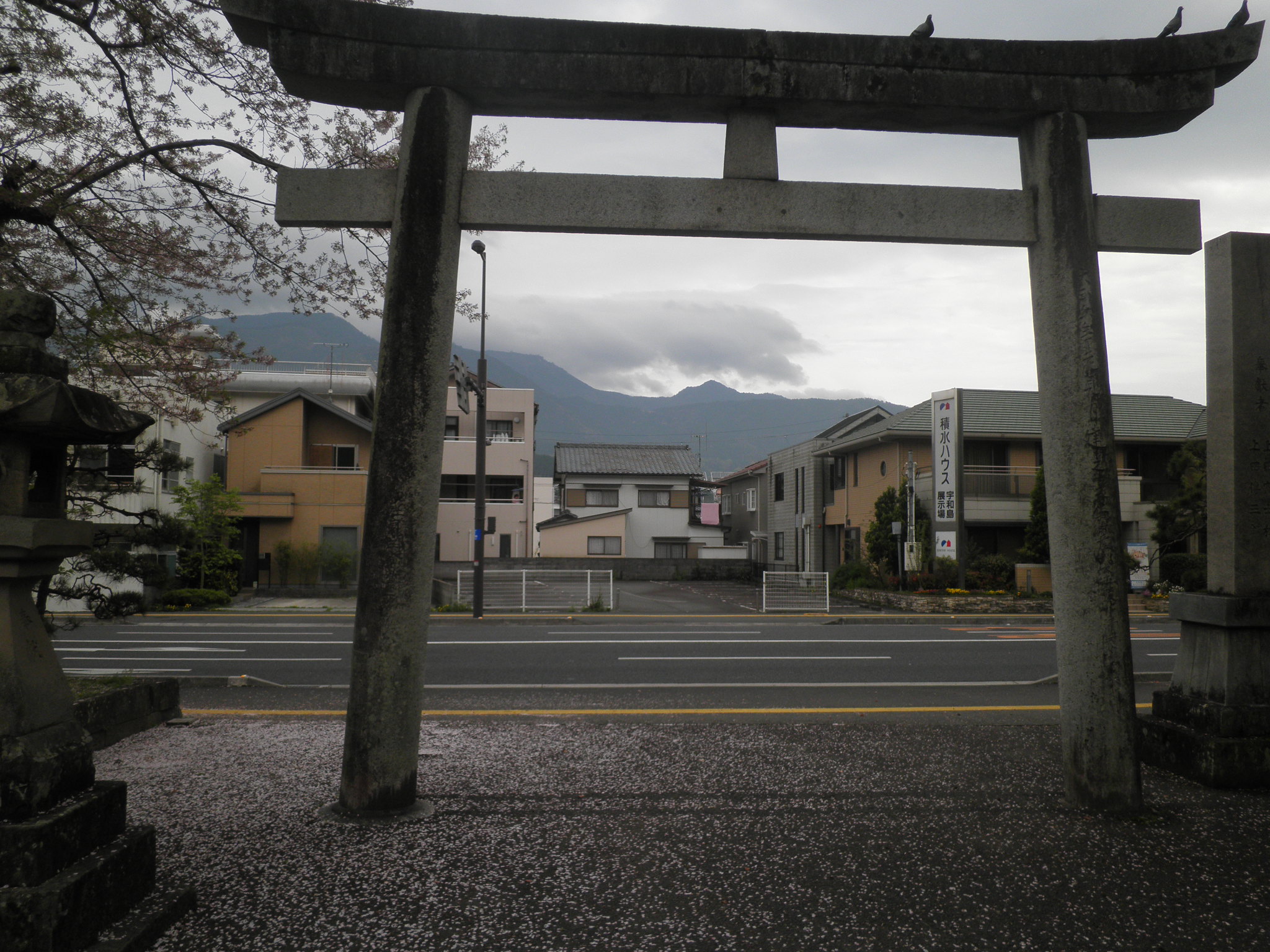 29 権現山 愛媛県宇和島市津島町山財 付近 前方遠くの突起が権現山です。市内の和霊神社の鳥居の向こうに見えます。ところが、方角がわずかにずれています。権現山を意識した神社ではないように思います。