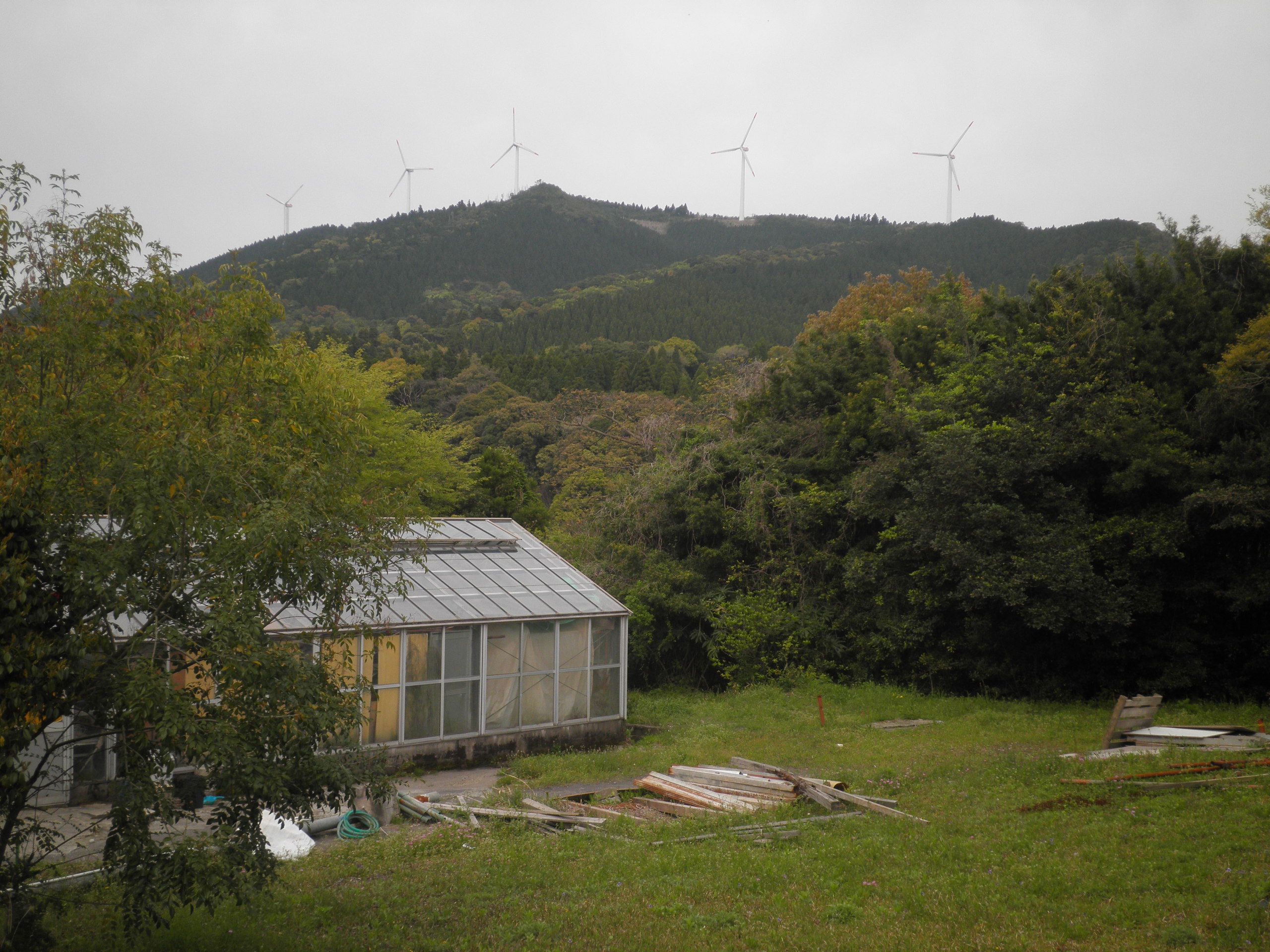 21 牟礼ケ岡(鹿児島県鹿児島市宮之浦町 付近 ) 山には風力発電設備がありました。山頂には大きな岩がありました。牟礼は岡という意味ですから、「岡ケ岡」あるいは「岡の中の岡」という意味になります。