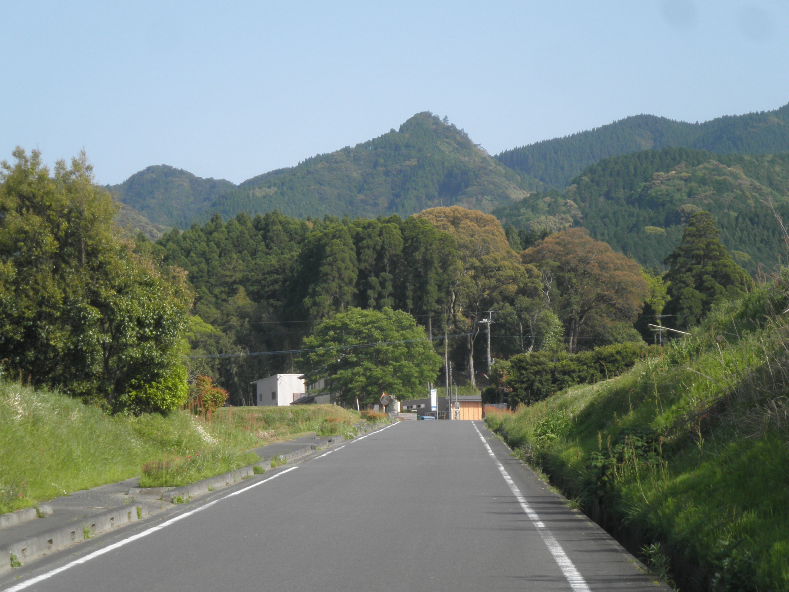 38 大野岡(宮崎県都城市豊満町 付近) 参道の先に猿田彦を祀る輿玉神社があります。大野岡はその背後の形良く見える山です。大野岡から惣陣が岡を結んだ先は、また牟礼ケ岡に続いています。