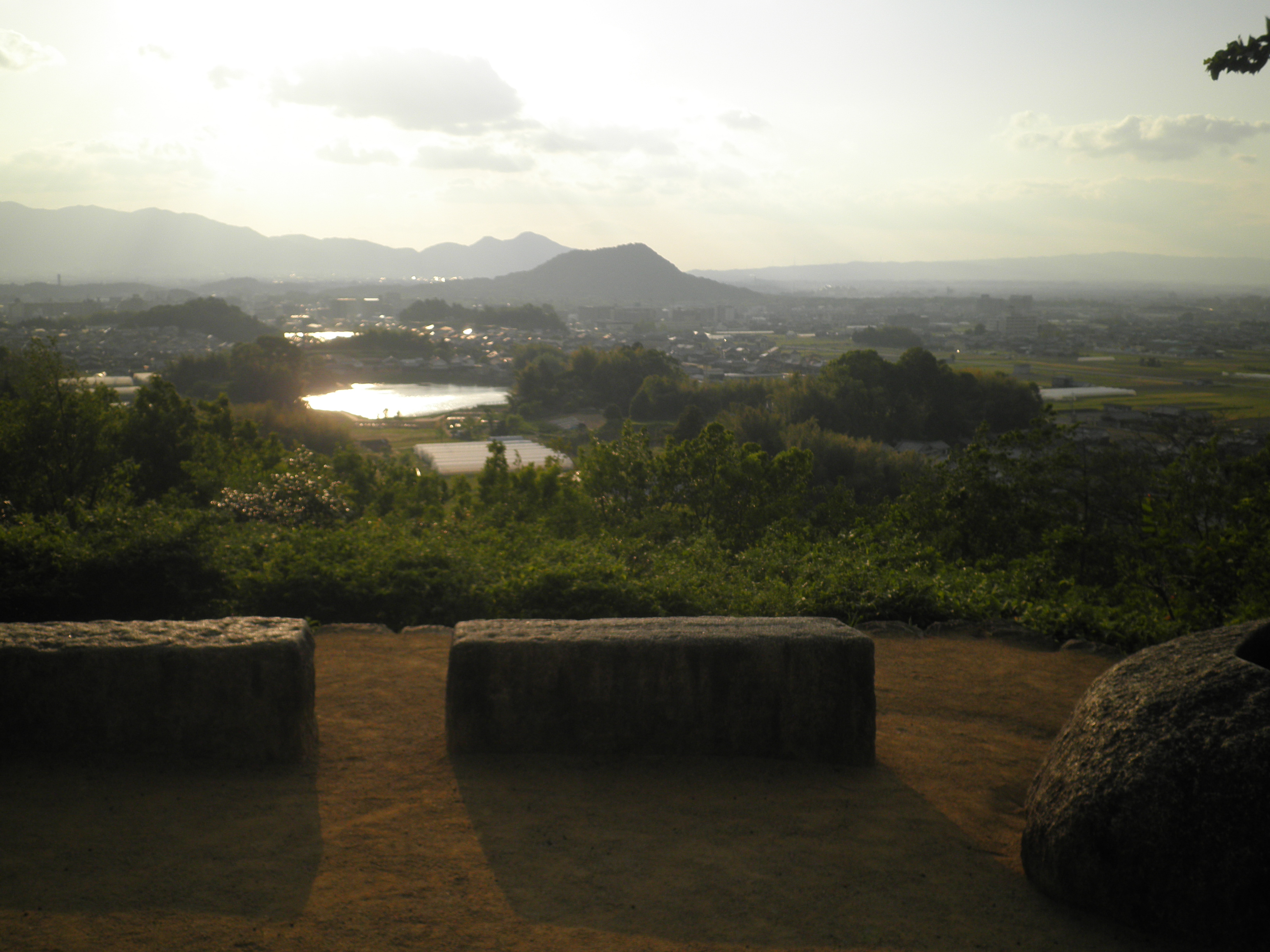 50 天樫丘(奈良県高市郡明日香村豊浦 付近) 甘樫丘から橿原宮を経て二上山に通じる直線は、夏至の日が沈むラインになります。