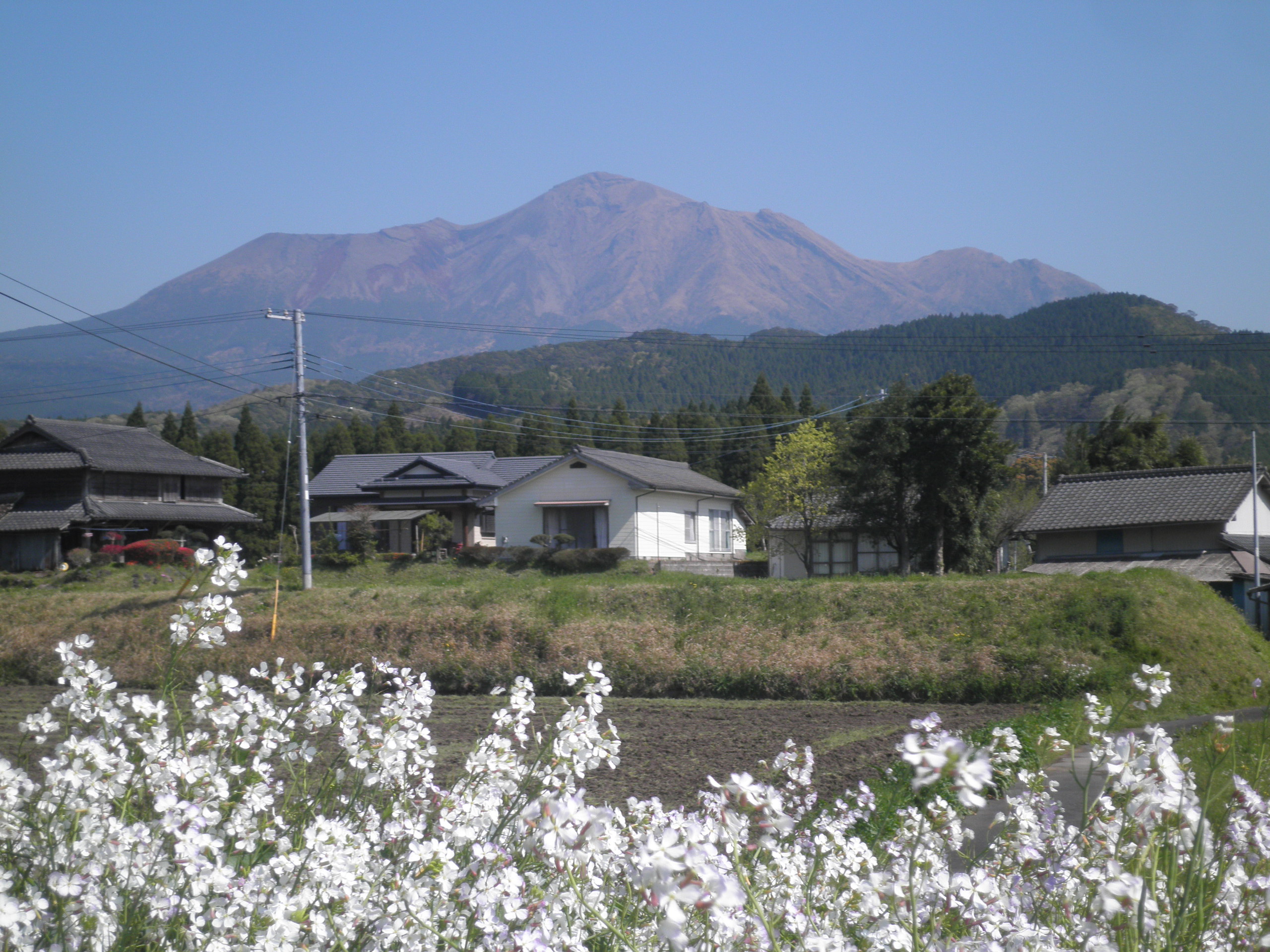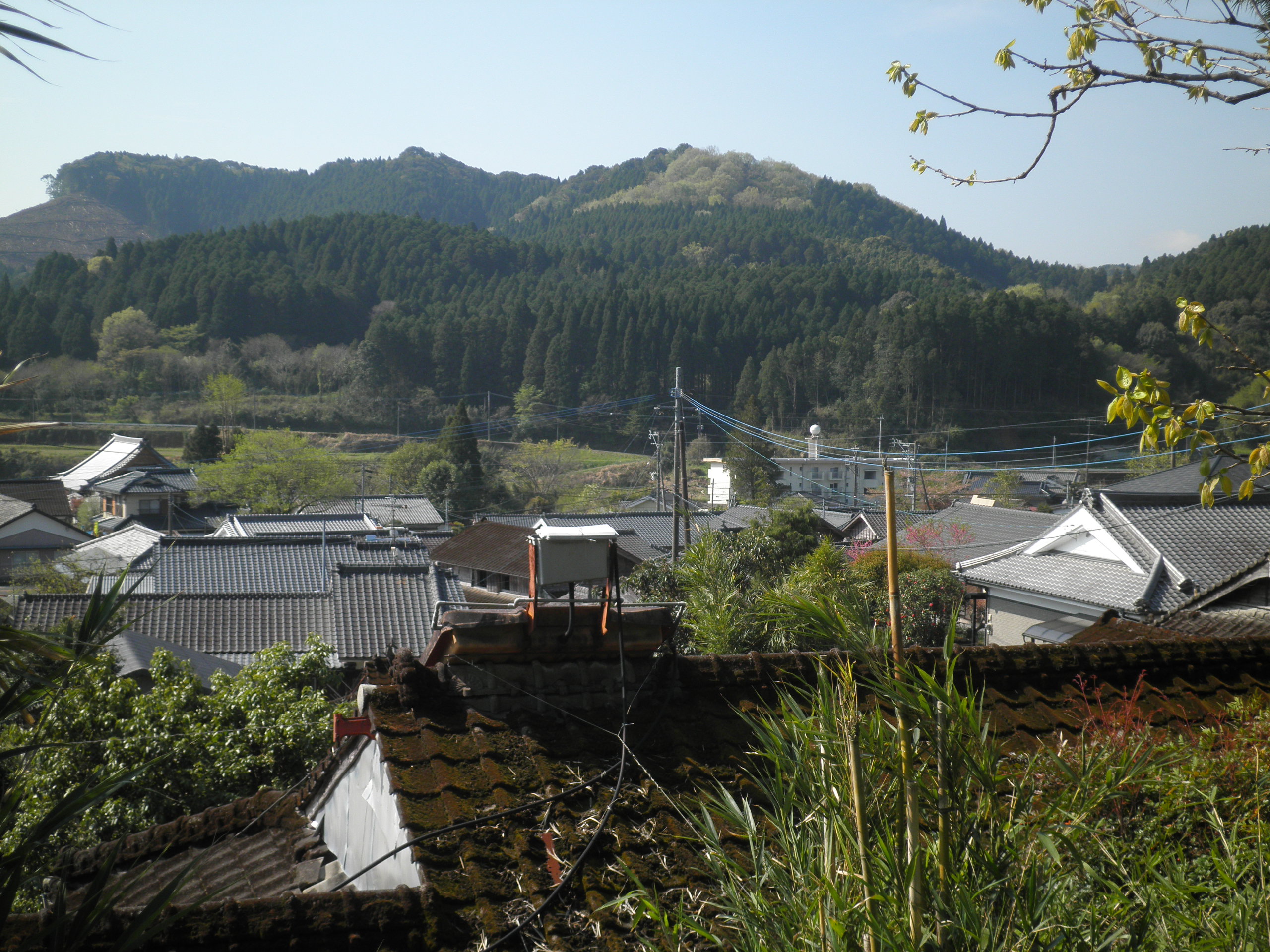55 陣ケ岡山(宮崎県都城市高野町 付近) 下段はこの付近から見た高千穂峰です。都城方向からの登山道がよく見えます。この山頂からニニギの登山をサポートしたのでしょう。