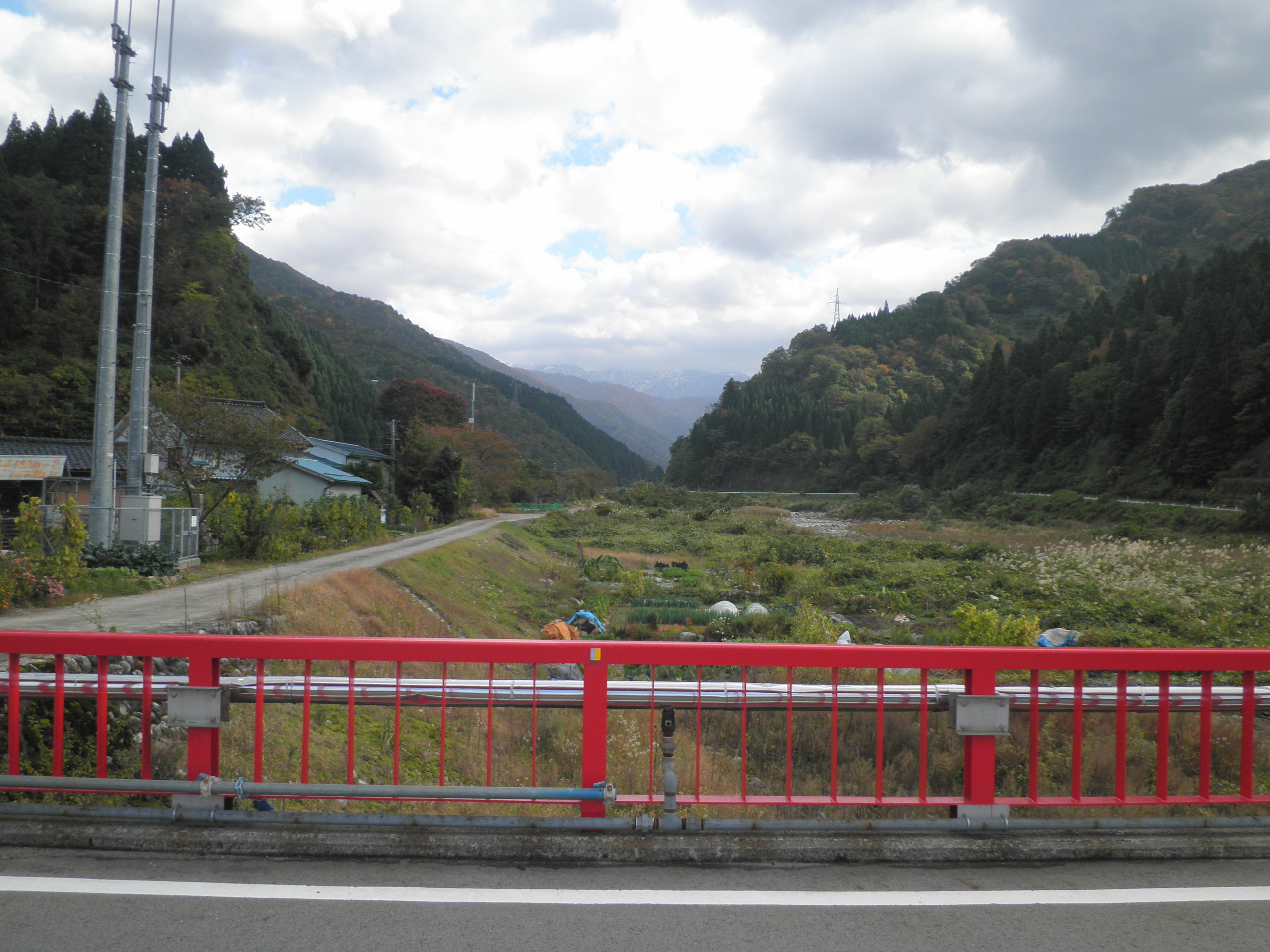 101 定倉山(富山県下新川郡朝日町山崎 付近 ) 小川の渓谷が前方に見えます。小川の源流域が定倉山で灌漑稲作の水を得る山の意味なのでしょう。下段画像中央左の右下がりの山です。山頂部は見えていません。
