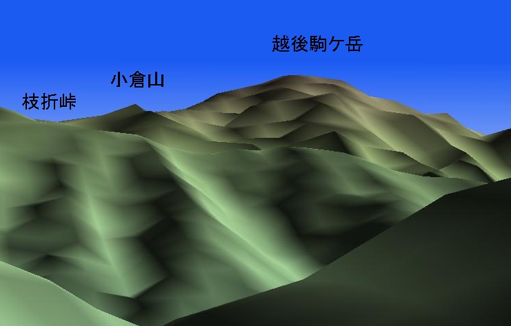 125 小倉山(新潟県魚沼市 付近 ) 東征隊はここまでやって来たのでしょう。枝折峠の近くに明神峠の名が地図に見えます。配置から小倉山は越後駒ケ岳を意識して添えた山であることが分かります。