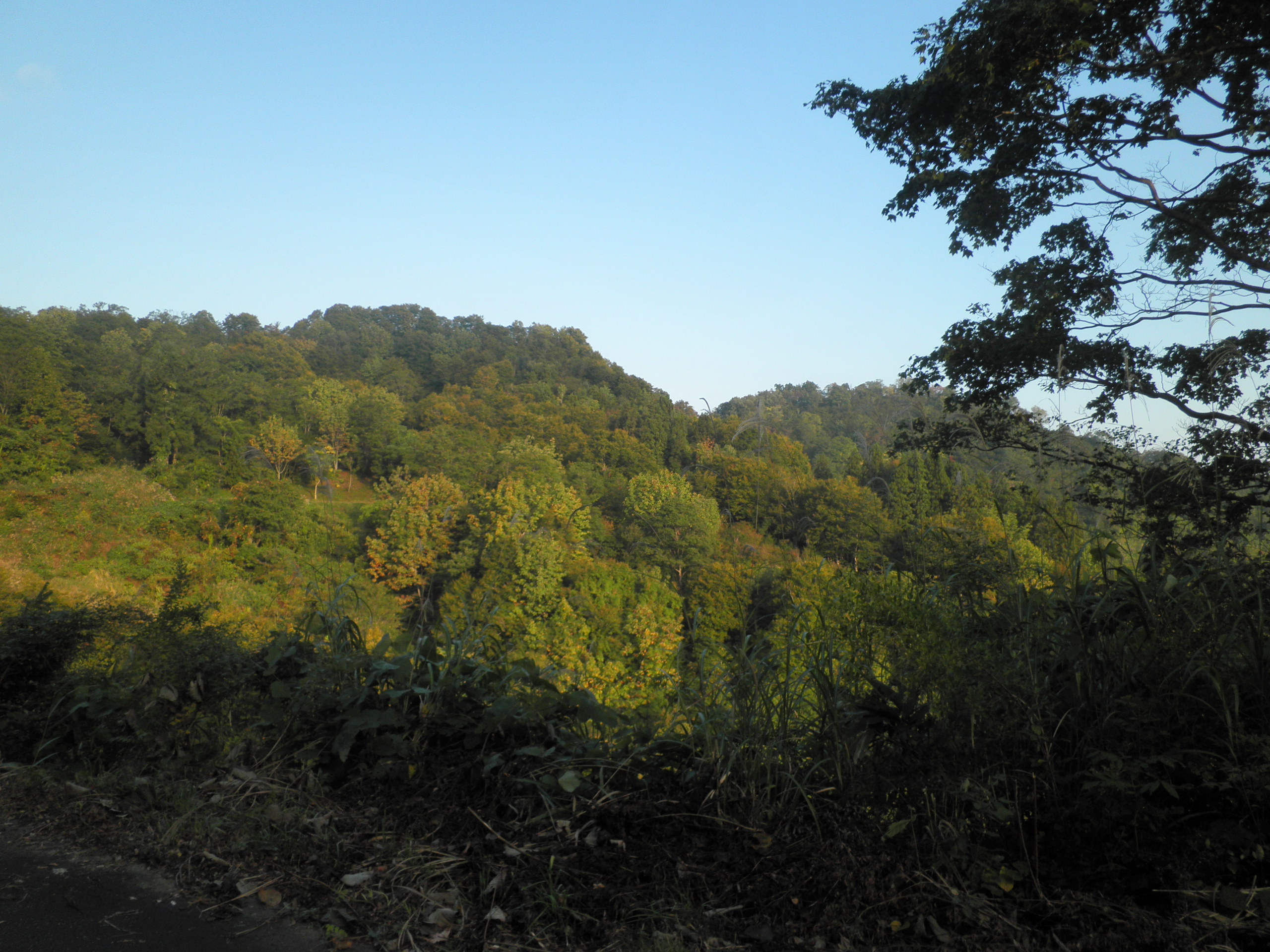 拡大  156 正面倉山(新潟県藷町市福島 付近 )ススキの林道を登ります。どこが山頂か、はたまた正面かよく分からない山です。前方左が山頂部と思われます。