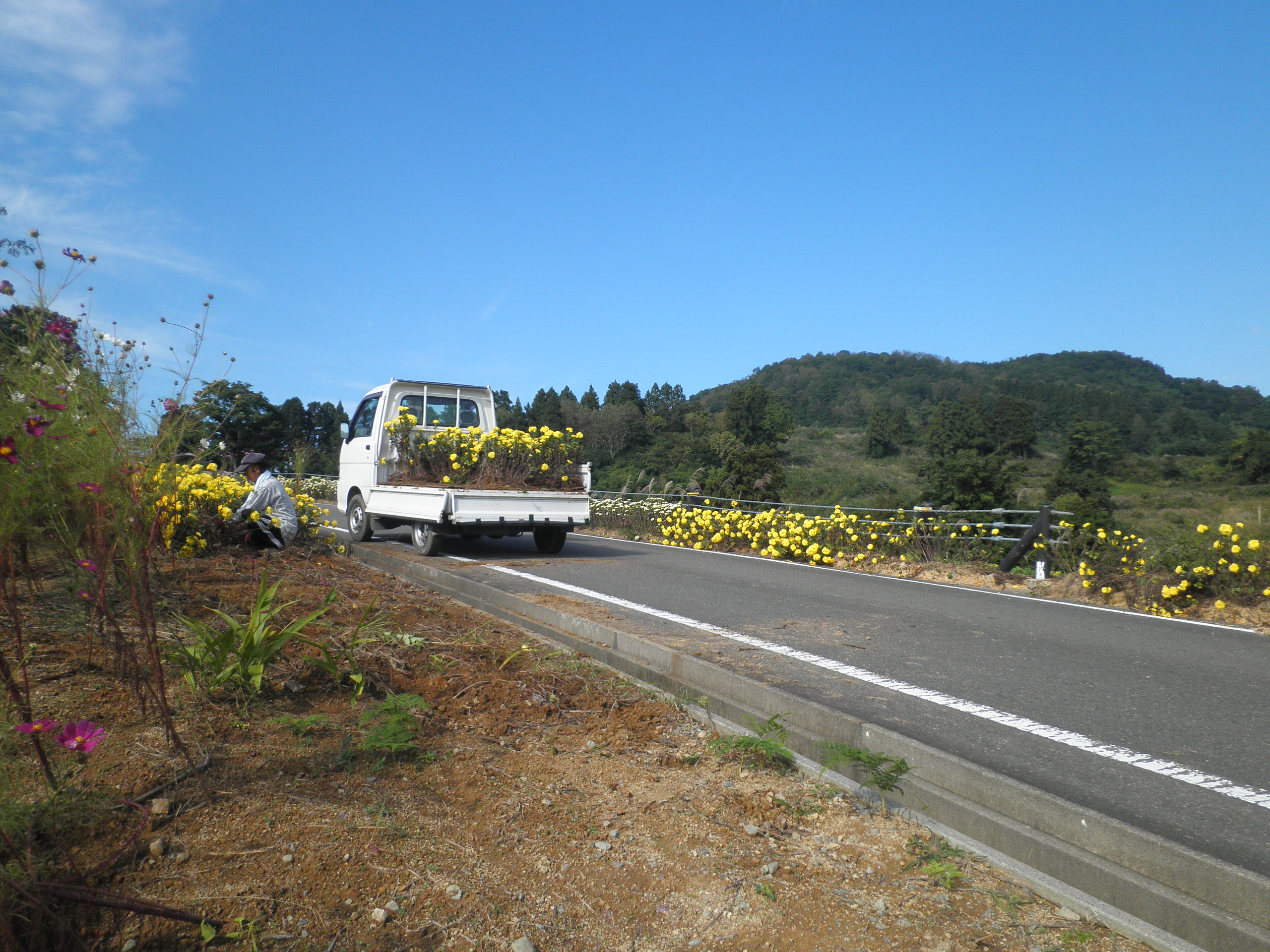 160 金倉山(新潟県小千谷市小栗山 付近 ) 山古志村の金倉山を訪ねると中腹で花畑の手入れされている方に合いました。個人でやられているとか。名前は金だがこの山は灌漑稲作の水を得るに適した山に名づけたのだろう。今は鯉の養殖に使用されていました。