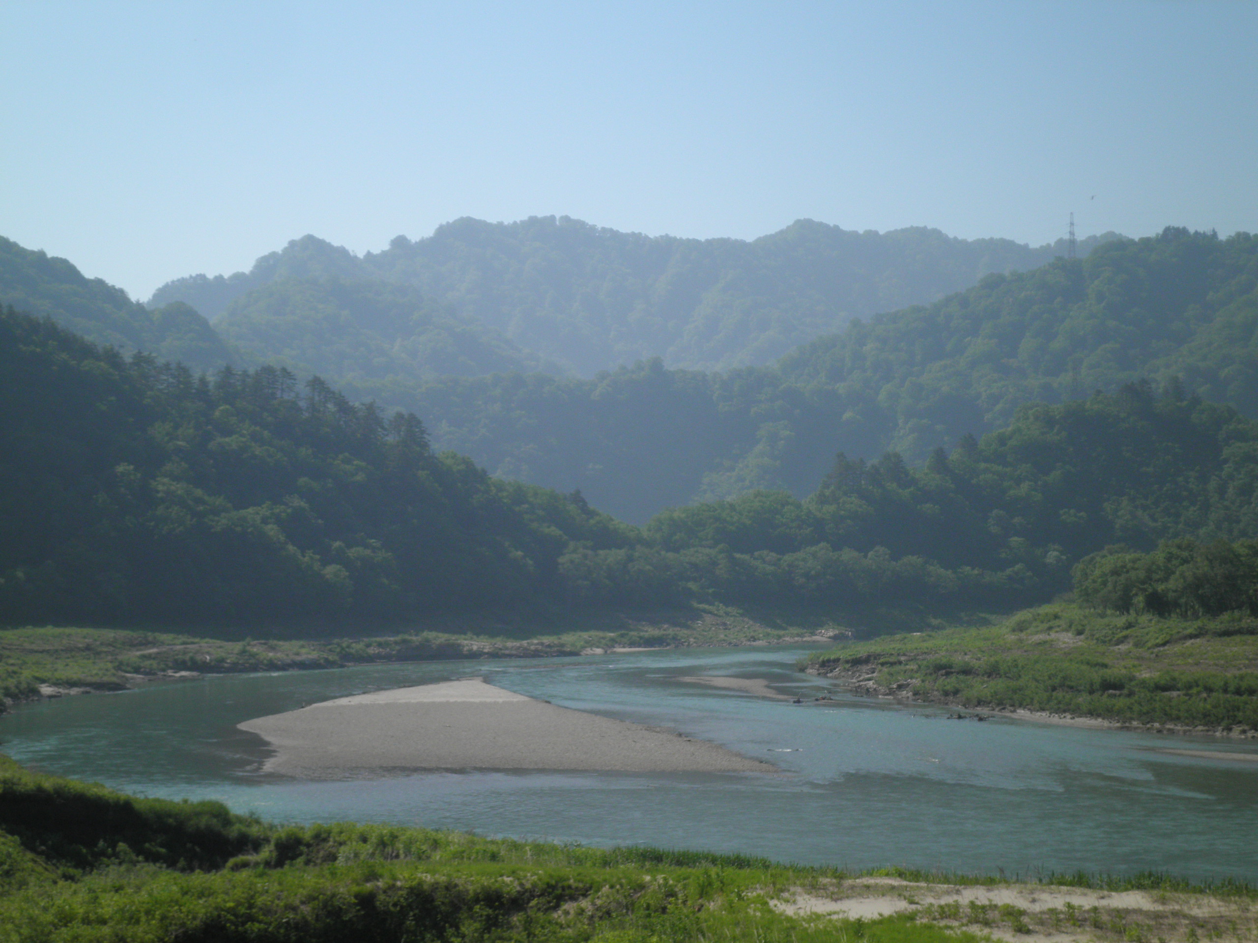 196 汝倉山(福島県大沼郡金山町田沢 付近 ) 谷を分け入ったが確定できなかった。廃屋の向こうの山か。只見川が大きく迂回する滝ダムから撮影した画像の最前方のぎざぎざの右端付近が山頂部です。