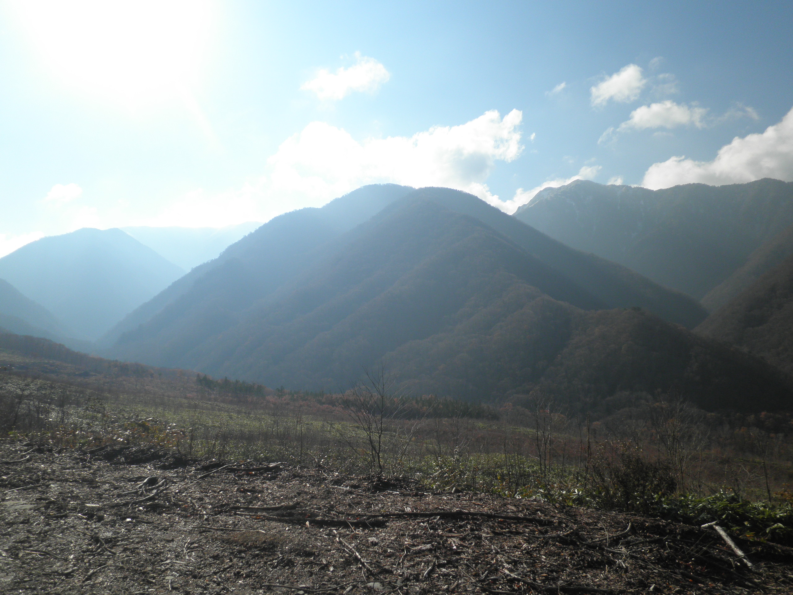 232 大倉山(福島県南会津郡下郷町野際新田 付近 )右側の高い尾根が続く左端にわずかに見えます。