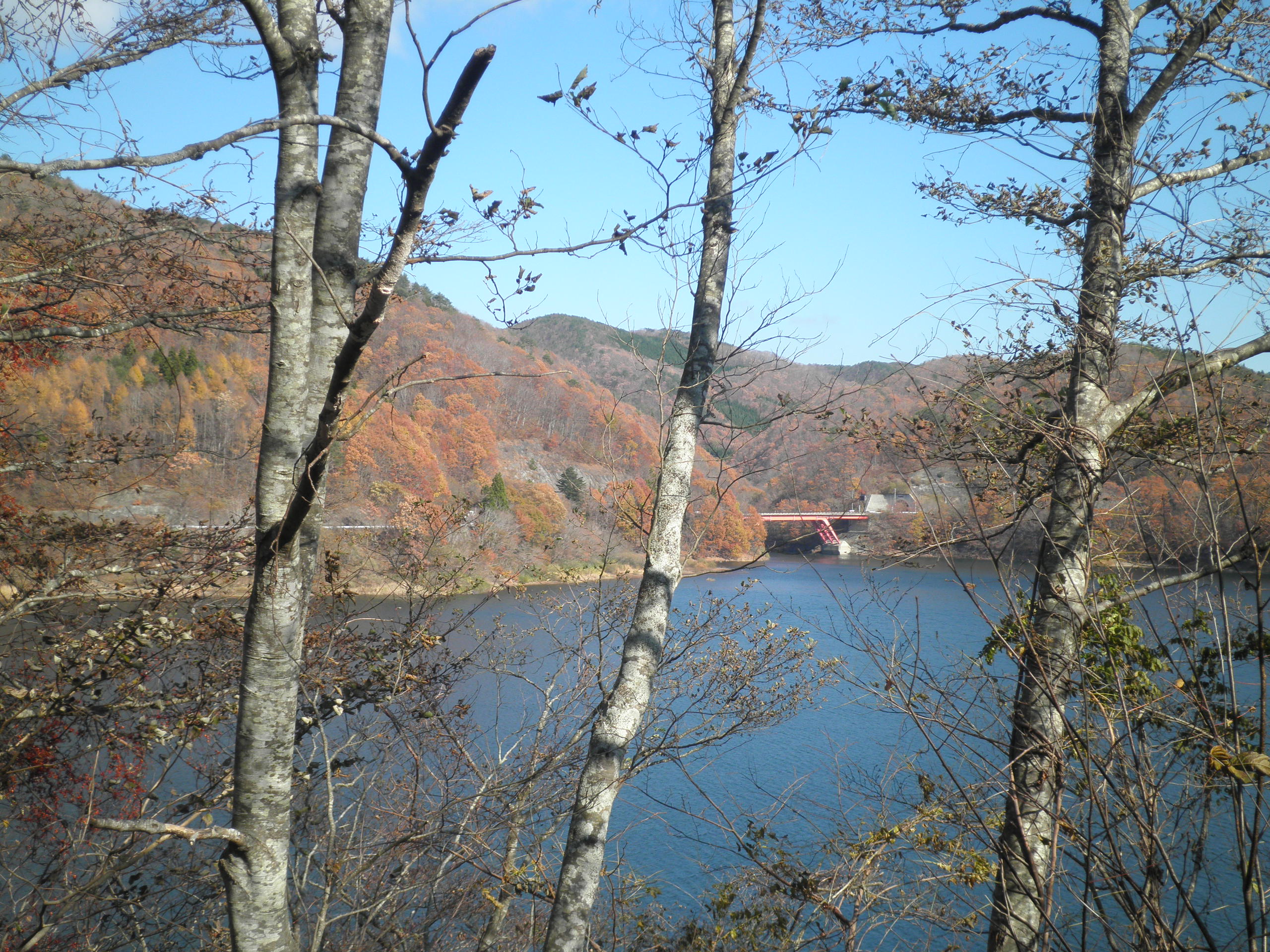 235 萩ノ倉山(福島県岩瀬郡天栄村田良尾 付近 )羽鳥湖の対岸でようやく萩ノ倉山が見つかりました。橋の向こう、やや左に見えます。萩ノ倉山は南会津にもありました。同じ名前の山をいくつか残していて、意味があるかもしれません。