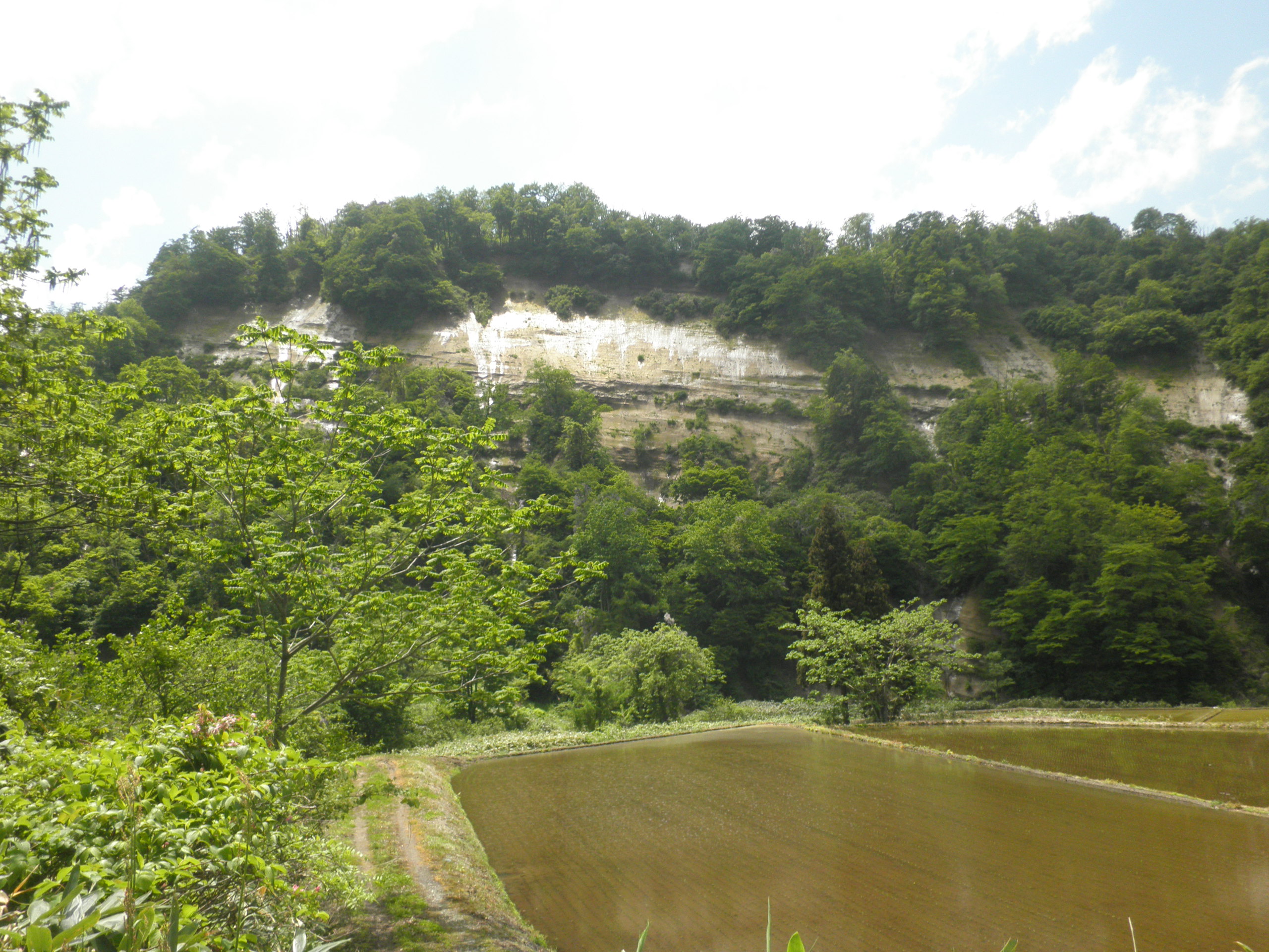 245 鍋倉山(山形県最上郡大蔵村赤松 ) 山肌が白く光り、水が滲み出ているように見えます。舟形町の高倉山に近く、この山の木を切り出し、小国川と最上川合流地点で舟を造った場所を指し挟んだと思われる。