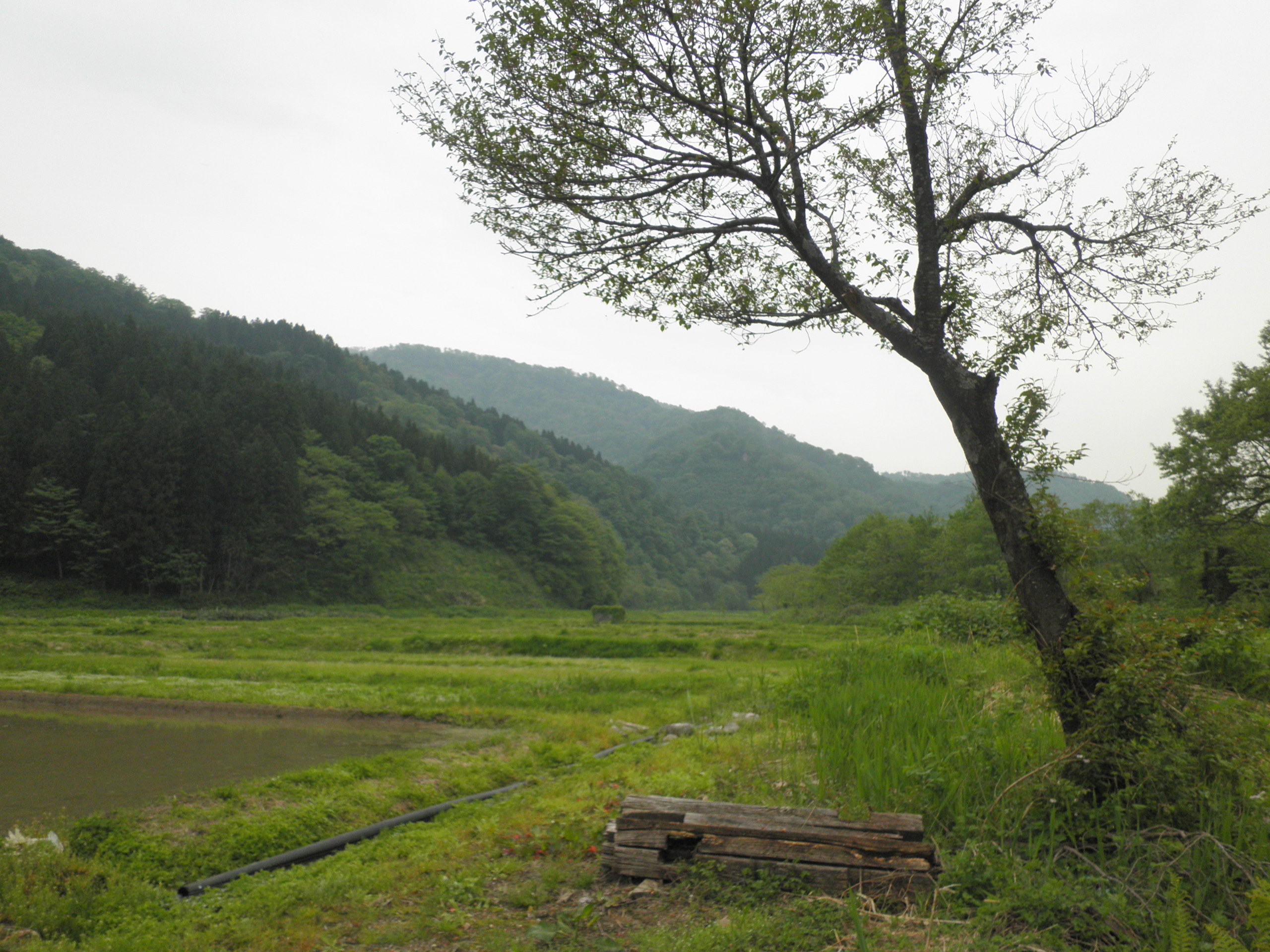 262 猿倉山(山形県鶴岡市大鳥 ) 雪解け水が激しく流れる山道を発電所まで進んだ。近すぎると見えない。戻るとワラビがたくさん出ている田んぼの横から見えました。前方中央の山だとワラビを採っている方が教えてくれました。