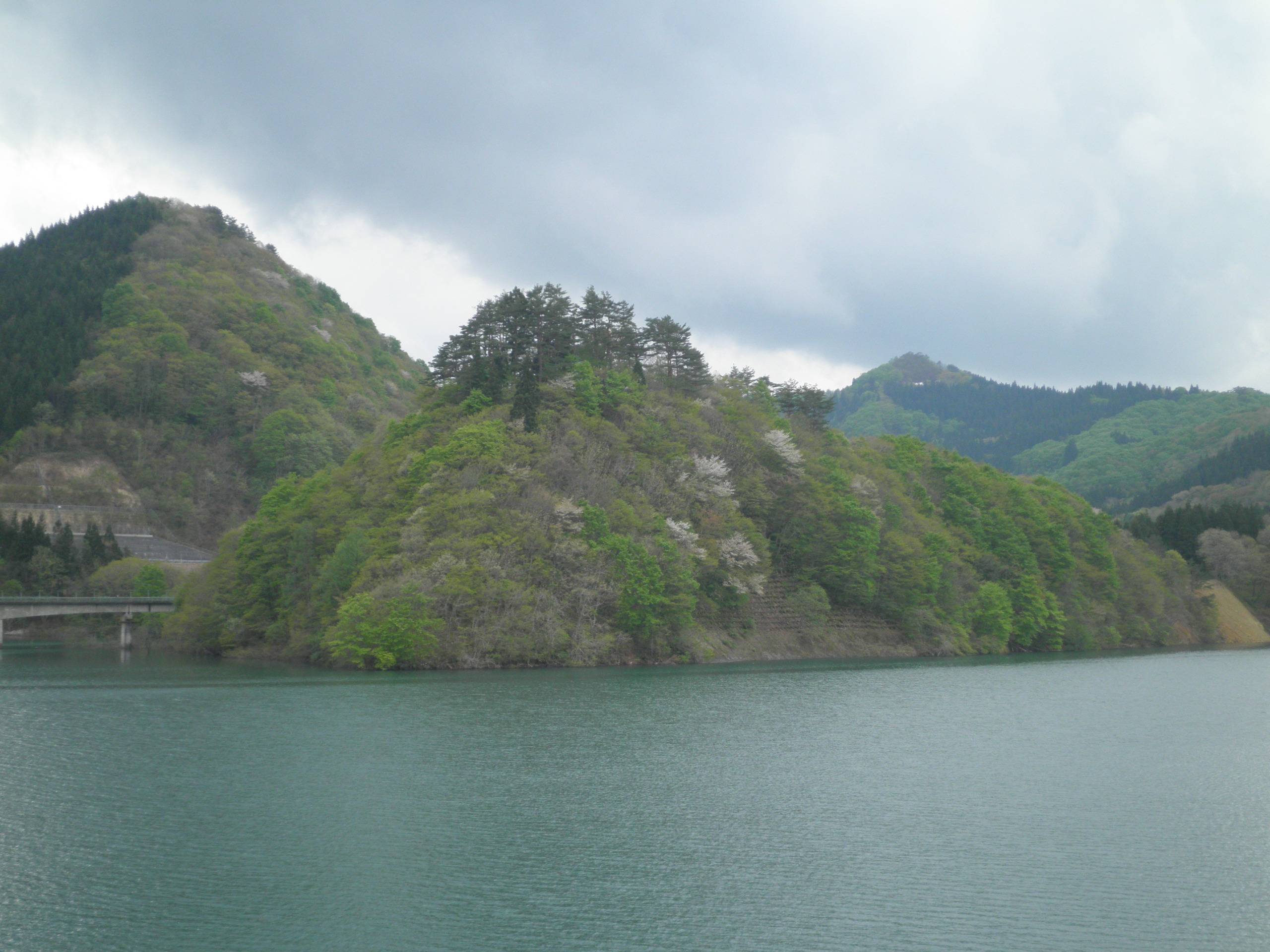 312 風倉山(岩手県和賀郡西和賀町鷲之巣 付近 ) 北上から横手に通じる道の錦秋湖畔から見ています。中央小山の山頂の林の横手奥に見える、遠くの三角山です。