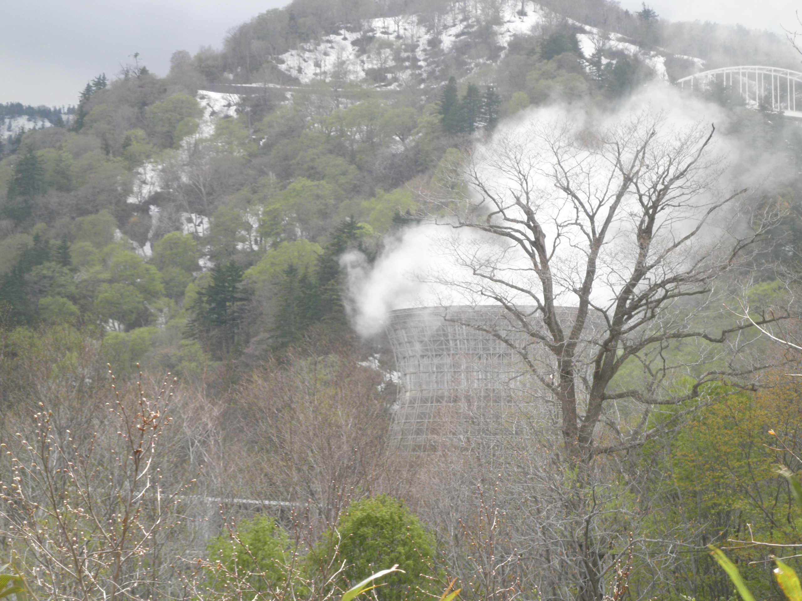 328 下倉山(岩手県八幡平市 付近 )道路前方の山が下倉山です。下段画像は松川温泉近くの地熱発電所の自然通風の冷却塔です。若き頃開発したヒシパッキンが充填されているはずです。