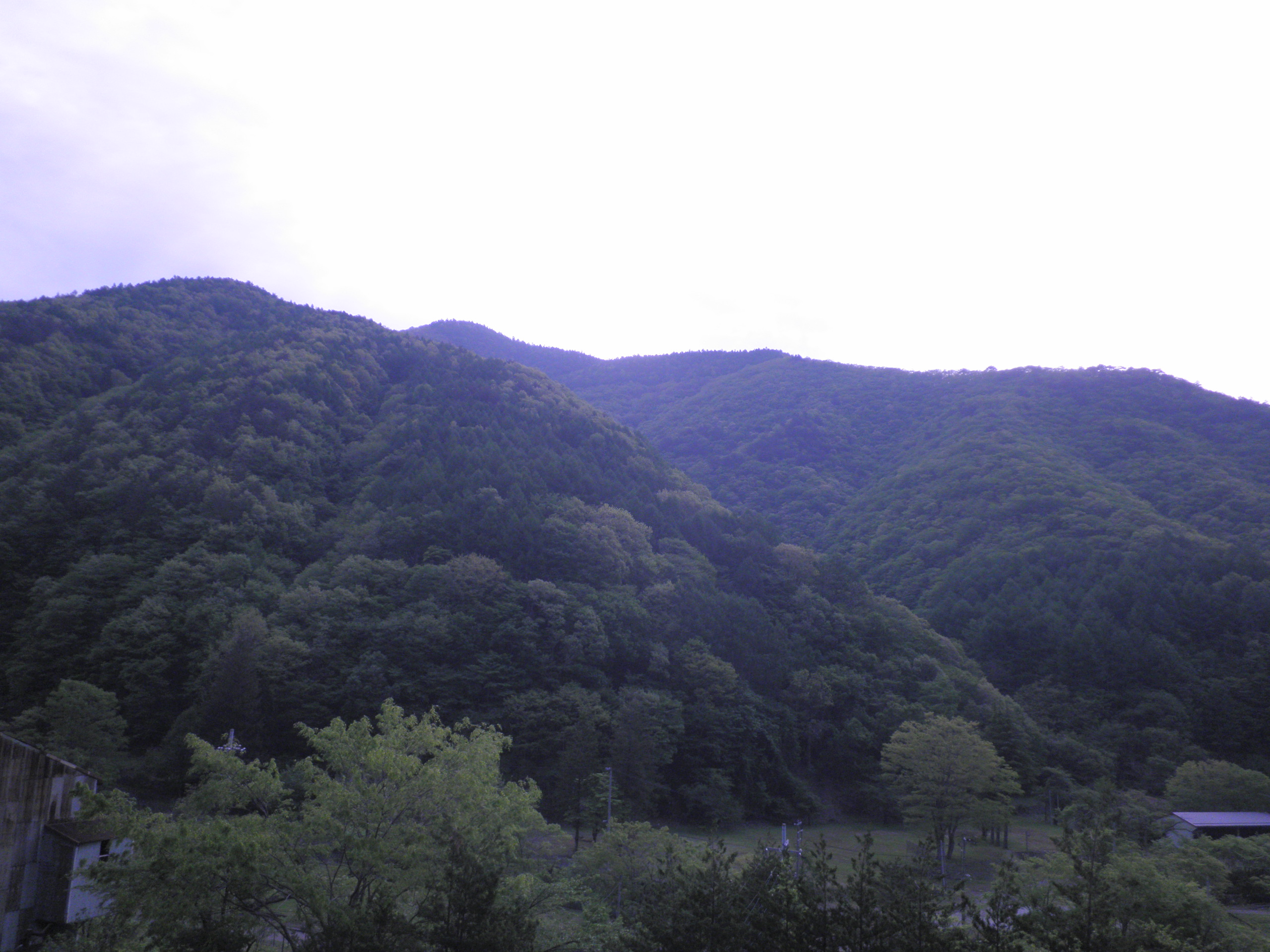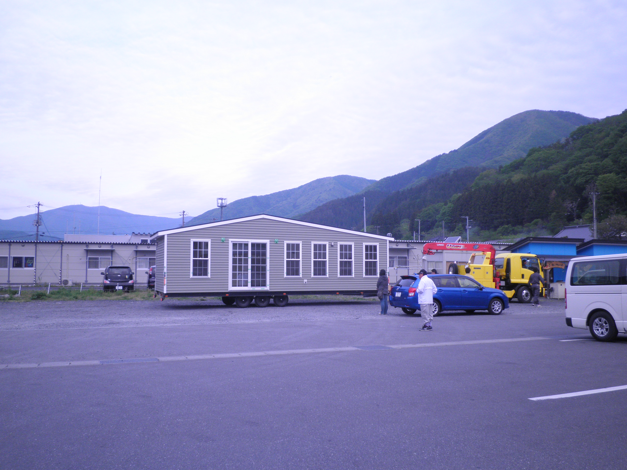 334 岩倉山(岩手県釜石市 付近 ) 手前の山越し遠くに見えるピークが岩倉山です。遠野に到る釜石街道の峠付近から見ています。下段は車中泊したコンビニ前の駐車場です。朝早くトレーラでハウスが到着して移動させられました。釜石の住宅需要に対応するのだろうか。