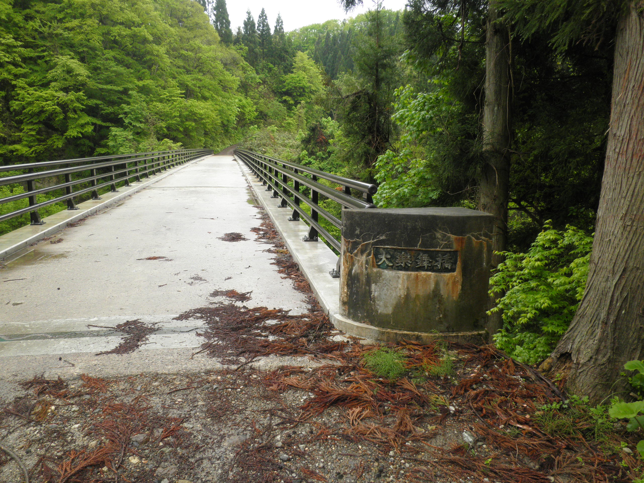 352 三本倉山(青森県平川市 付近 ) これから進んだ方角を三本の線で示したという名づけです。位置が重要なため山を特定することが困難でした。大落前川にかかる大楽舞橋から見た前方の山が、三本倉山の尾根とみられます。