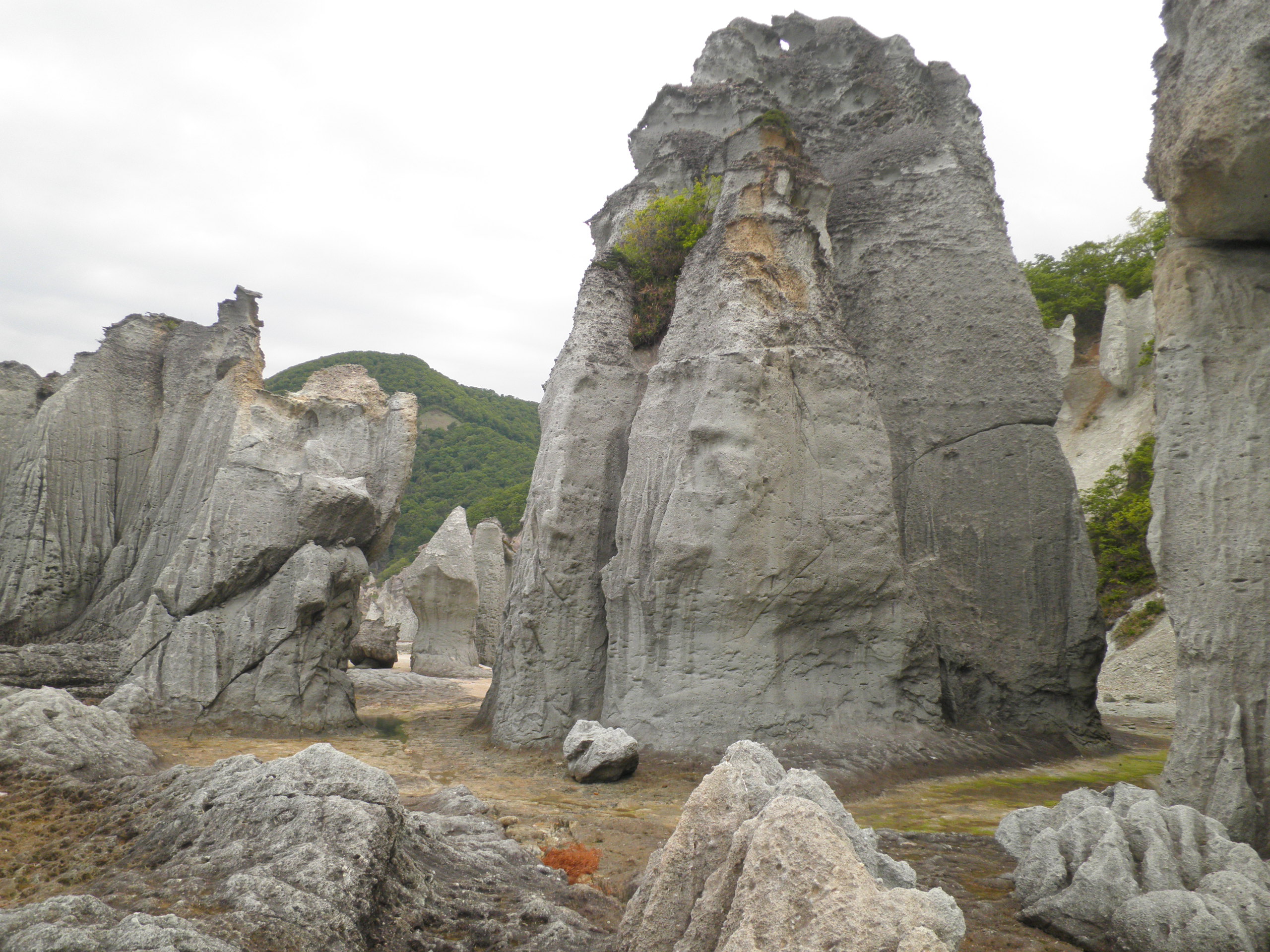 353 ー倉山がんくらやま(青森県むつ市 付近 ) 下北半島を横断した証しの山です。付近だけが高原のようになっていて、人が住んでいました。中央奥が山頂部です。下段は仏ケ浦でこの先にあります。海岸へ降りるのさえ大変な絶壁が続きます。