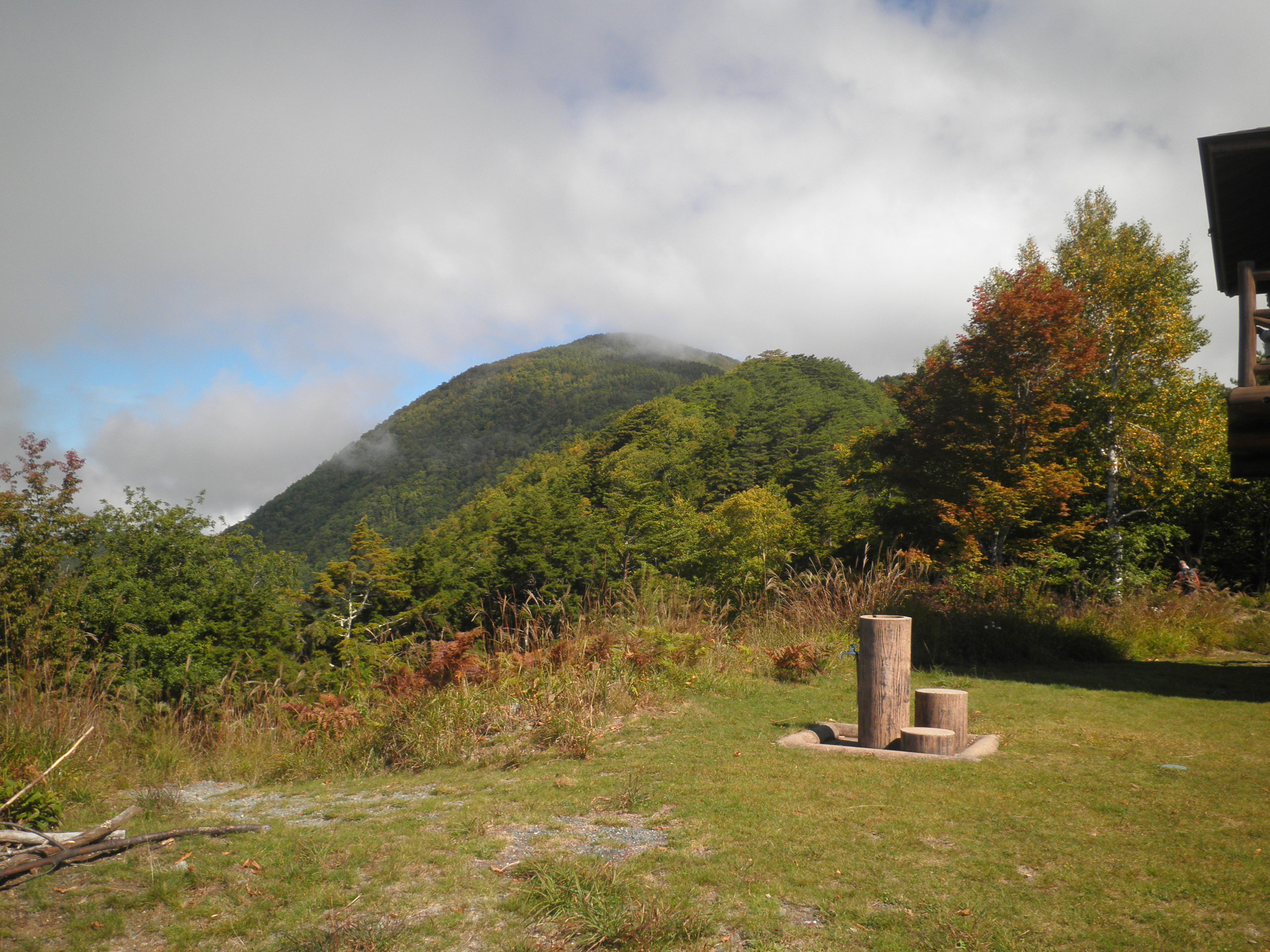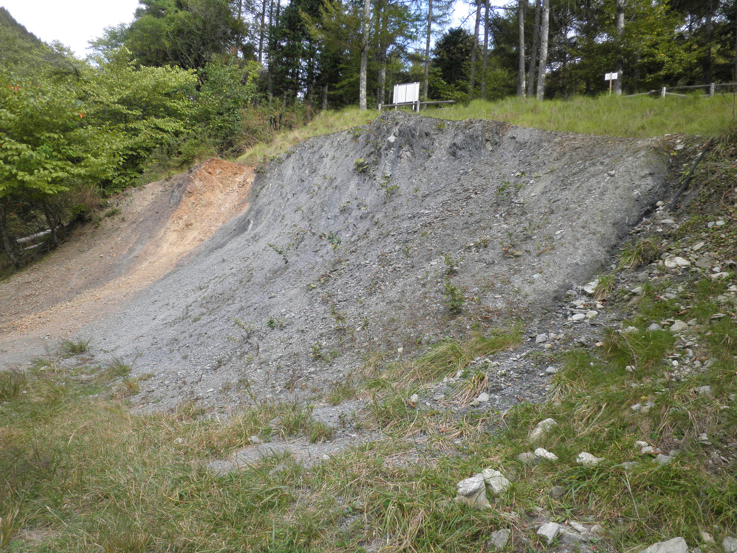 拡大  74 鳥倉山(長野県下伊那郡大鹿村大河原 付近 ) 中央構造線の露頭がところどころにある山峡を進みました。土の色が変わるのは、構造線の境が露出したところです。山中の道を延々と登りパノラマ展望台に出ました。その横が鳥倉山です。