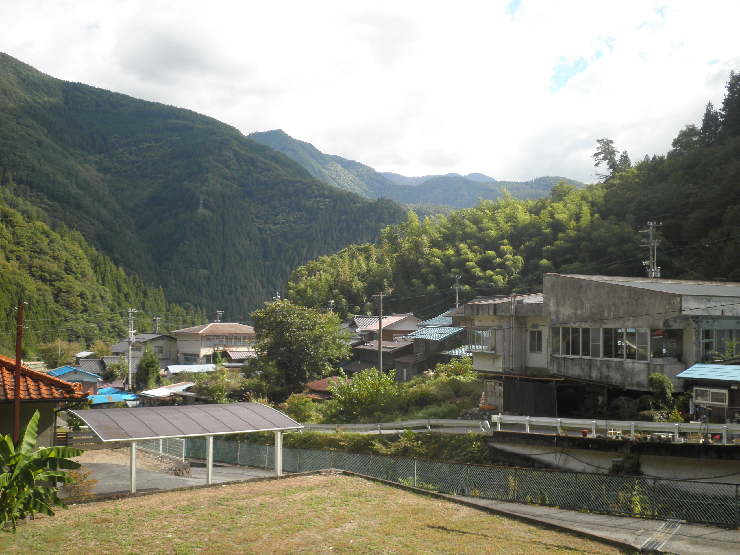 79 白倉山(長野県飯田市南信濃八重河内 付近 ) 前方中央左に鋭く立ち上がるあたりが、山頂部です。ようやくこの場所から見えることを見つけました。ここにも神楽の伝承があるようです。