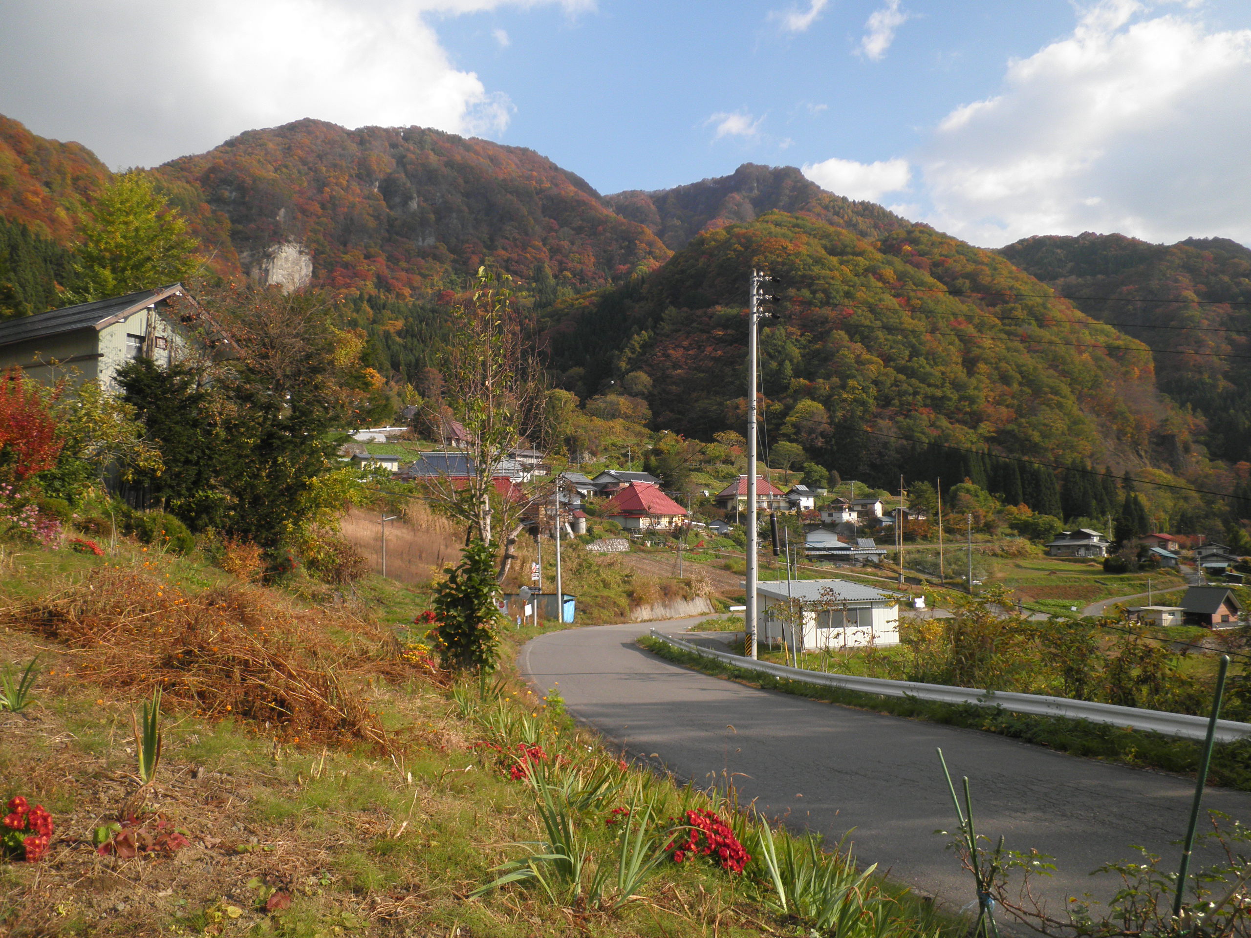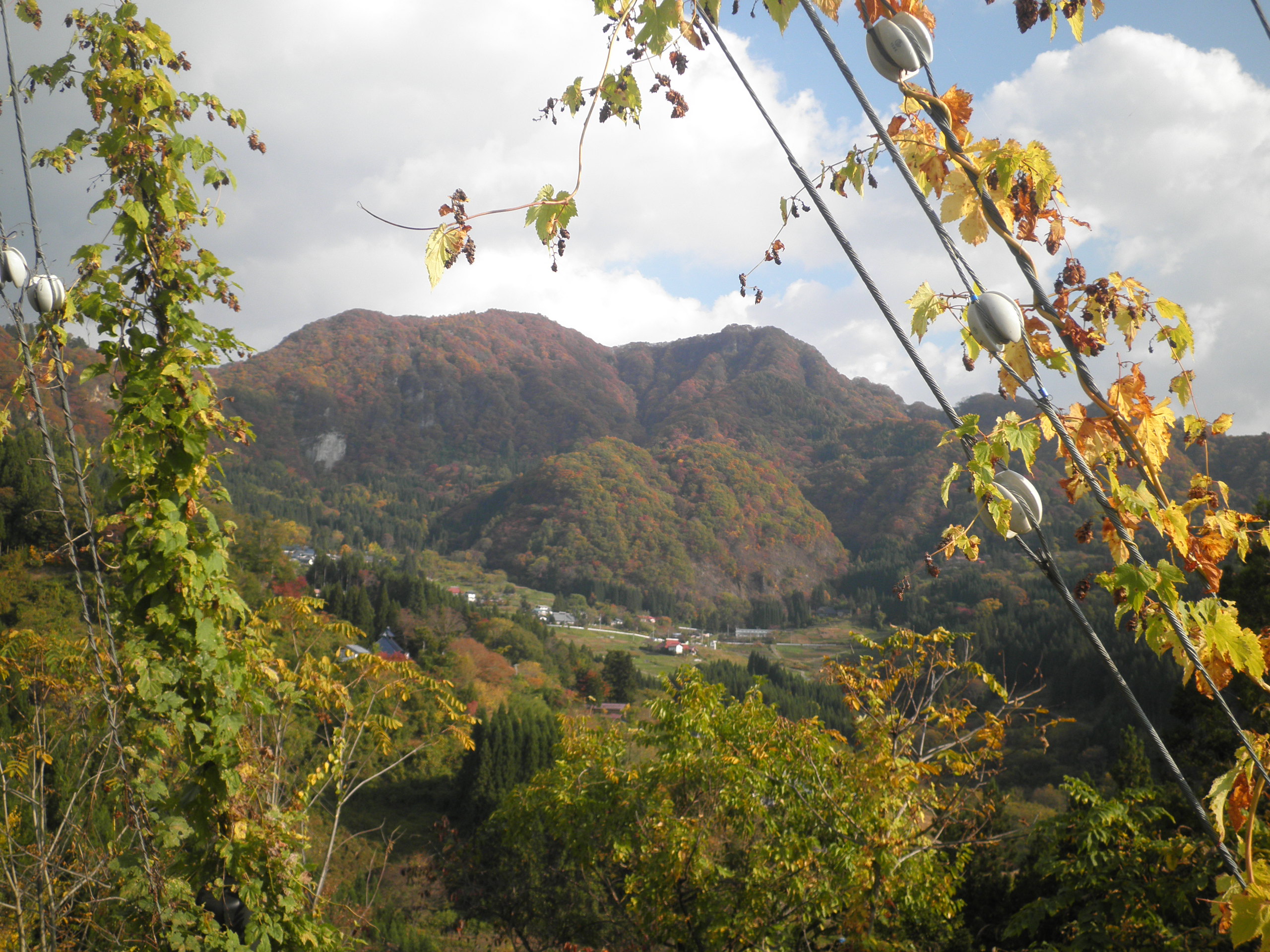 81 虫倉山(長野県長野市中条御山里 付近 ) 前方中央より右の電柱が指し示す山が虫倉山です。東征隊もこの山深い中にいたり、絶景の山を見たのでしょう。下段画像は近くにあった恩賜公園付近から見ています。