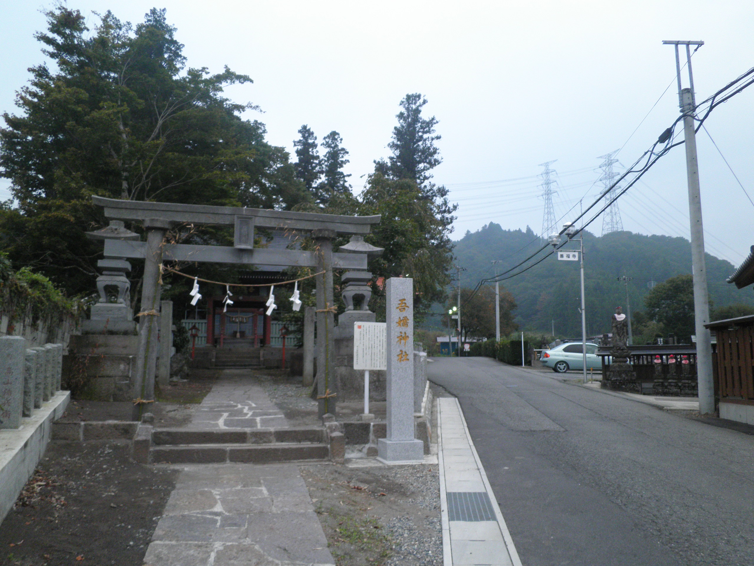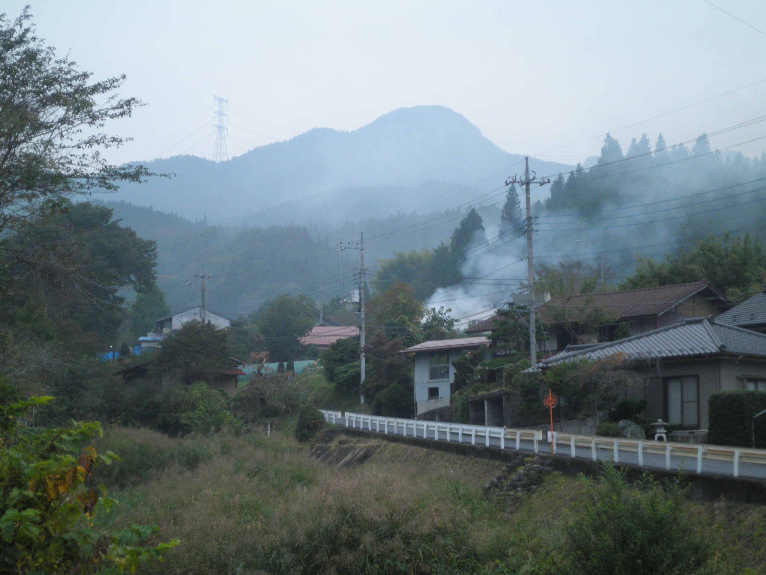 7 吾嬬山 (群馬県吾妻郡東吾妻町岩下 付近 ) 東吾妻町の大宮岩鼓神社横から吾嬬山の北側に迂回して、近づきました。下段画像の吾嬬神社が見えてきました。さらに山あいに入ると、吾嬬山が形良く見えます。朝の支度の煙がたなびく向こうに見えます。