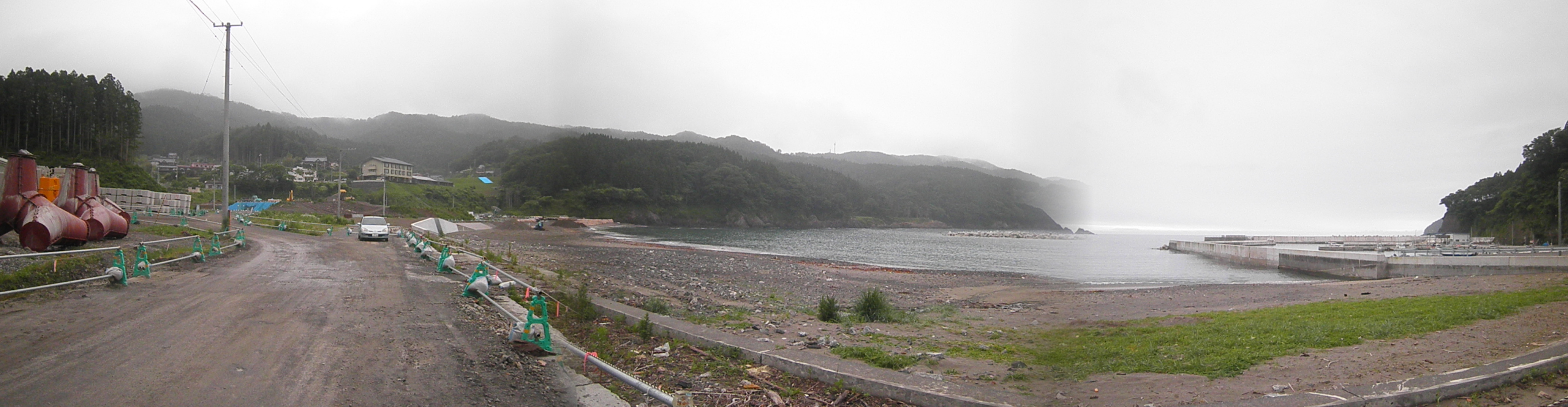 100 白浜 (岩手県大船渡市三陸町綾里白浜 付近 )深い大船渡湾を横切り、綾里湾に入っています。現地は復旧工事が行われている状況です。下段画像の中央鉄塔の下の茶に枯れた林付近まで水が来たが、そこにある神社は大丈夫だったと地元の方が話されていました。