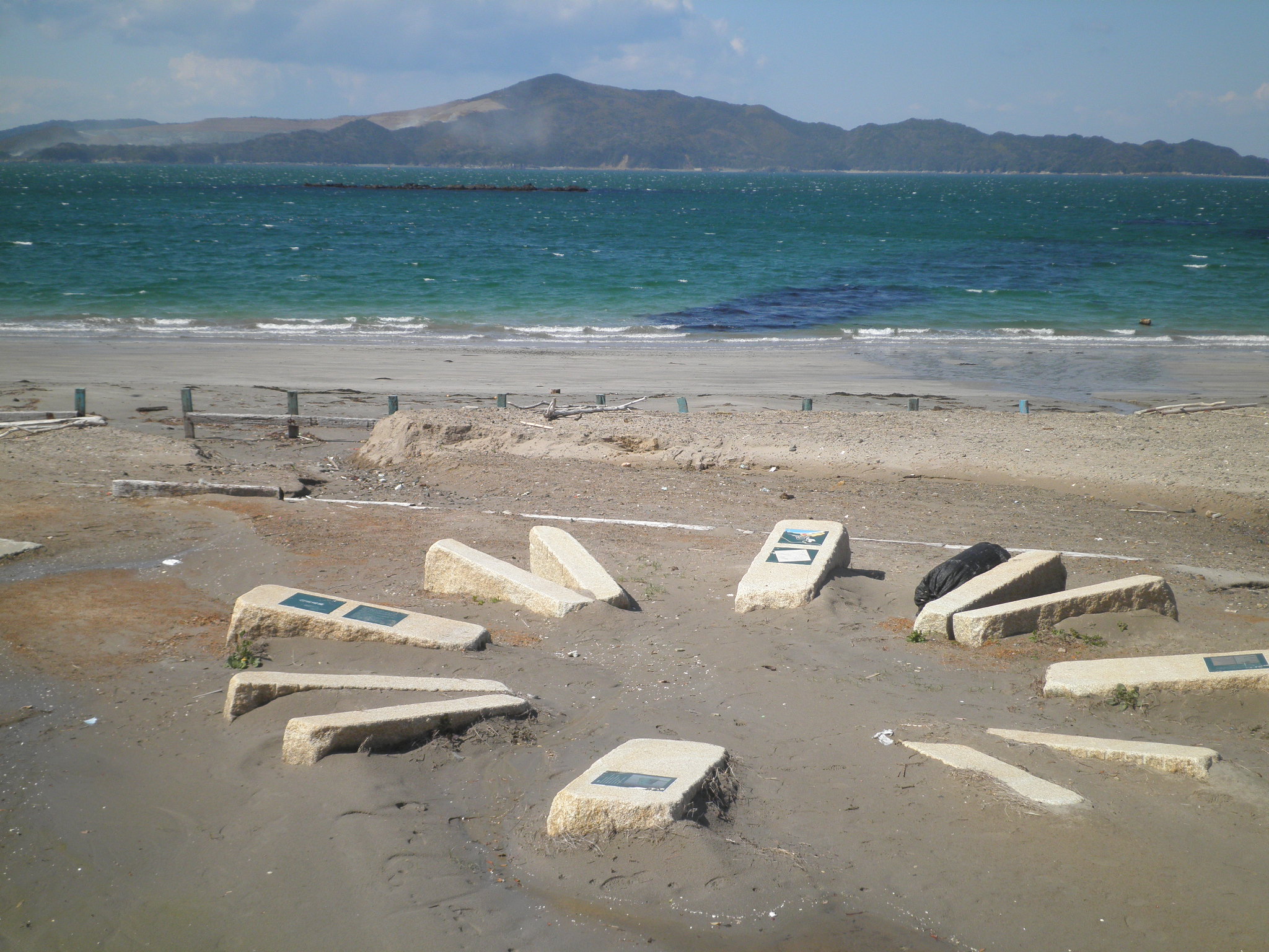 25 長崎鼻 (三重県鳥羽市菅島町 付近 ) 長崎鼻のある菅島をパールラインから見ています。長崎鼻は右端付近ですが確定できませんでした。足もとに見えるのが白浜です。下段画像はその白浜に下りていますが、小さな白浜遺跡がありました。銅鐸が出ています。