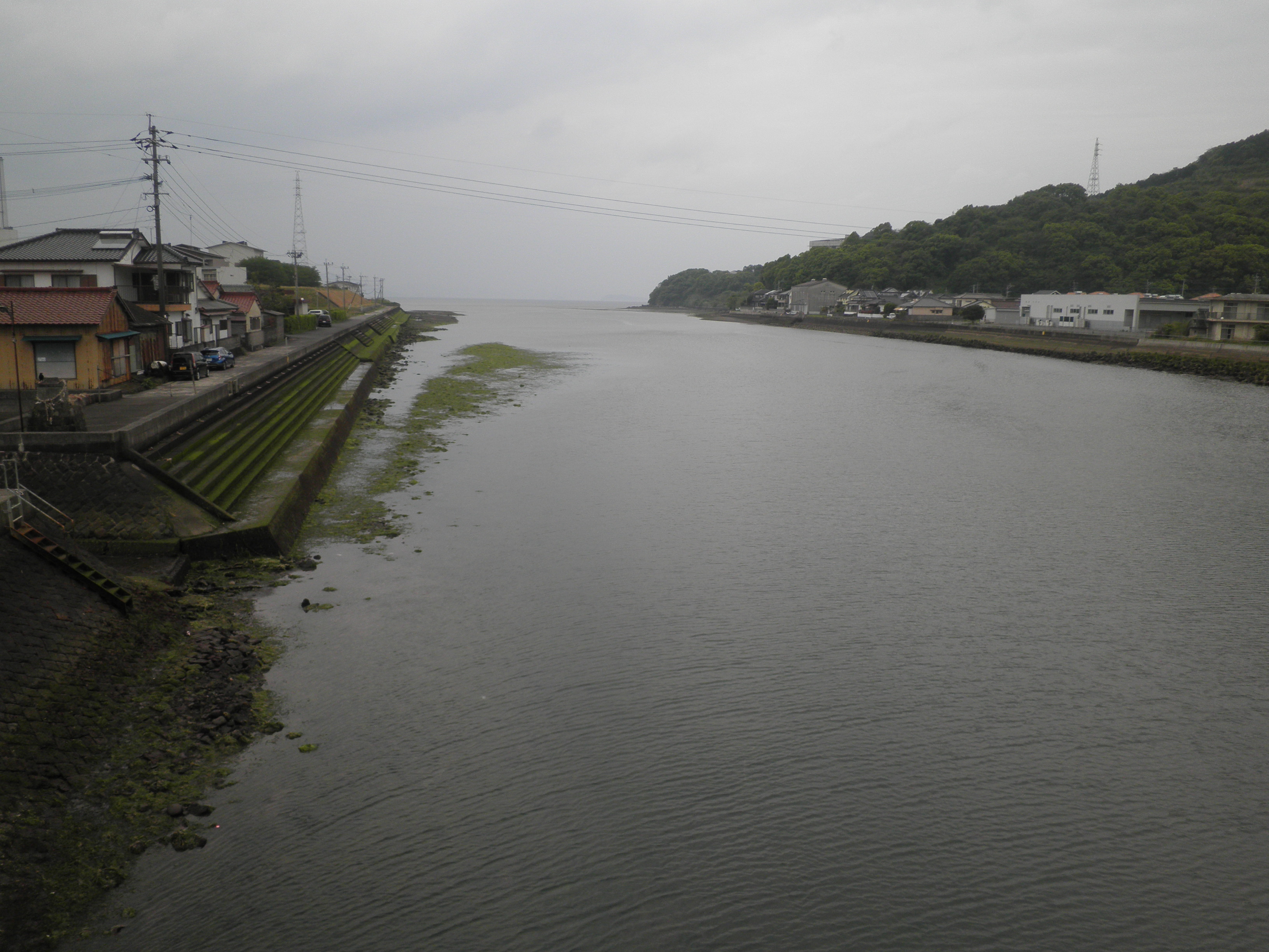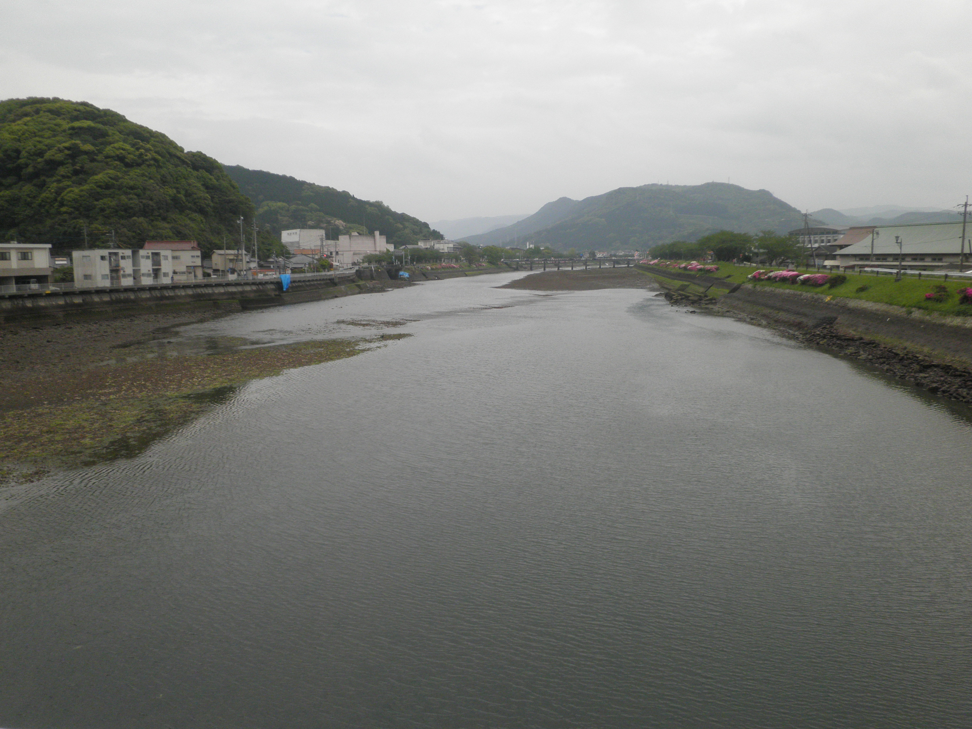 45 白浜 (熊本県水俣市白浜町 付近 ) 水俣川の橋の上から撮影しています。火口に向かって右が白浜ですが昔の面影はありません。地元の人が、上流にダムができてから、駄目になったと話していました。下段画像が上流を見ています。