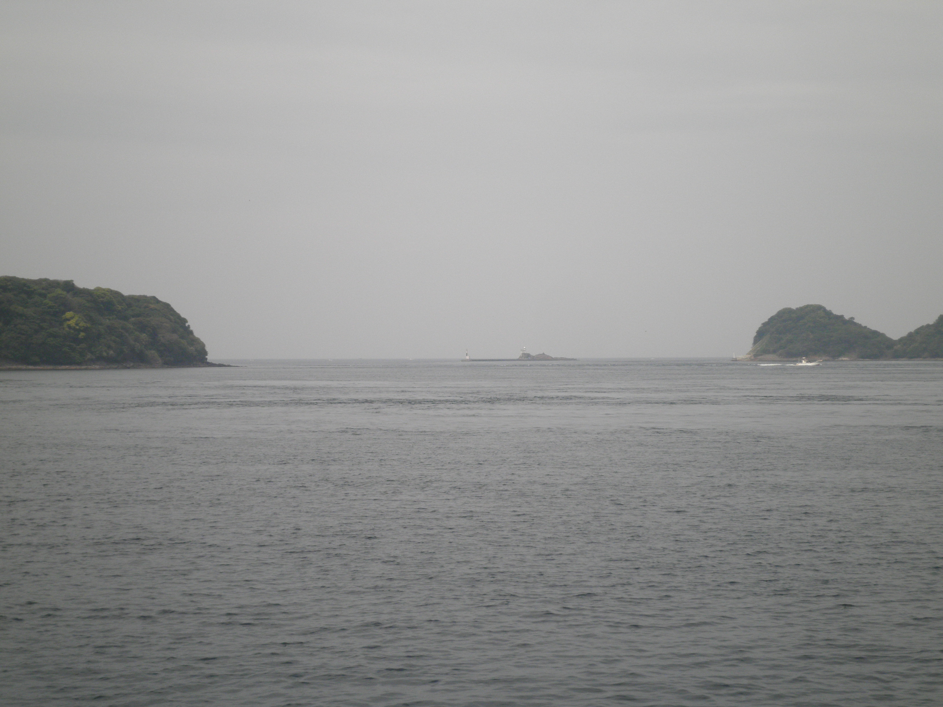 54 白浜 (長崎県平戸市岩の上町 付近 ) 浜はすでになく岸壁の漁港となっていました。上段画像の前方に赤い平戸大橋が見えます。古代、丸木船のようなもので通ることができたか、地元の方にお聞きしました。下段画像の瀬戸出口付近や大橋付近に渦を巻く箇所があるが、通れたという意見でした。