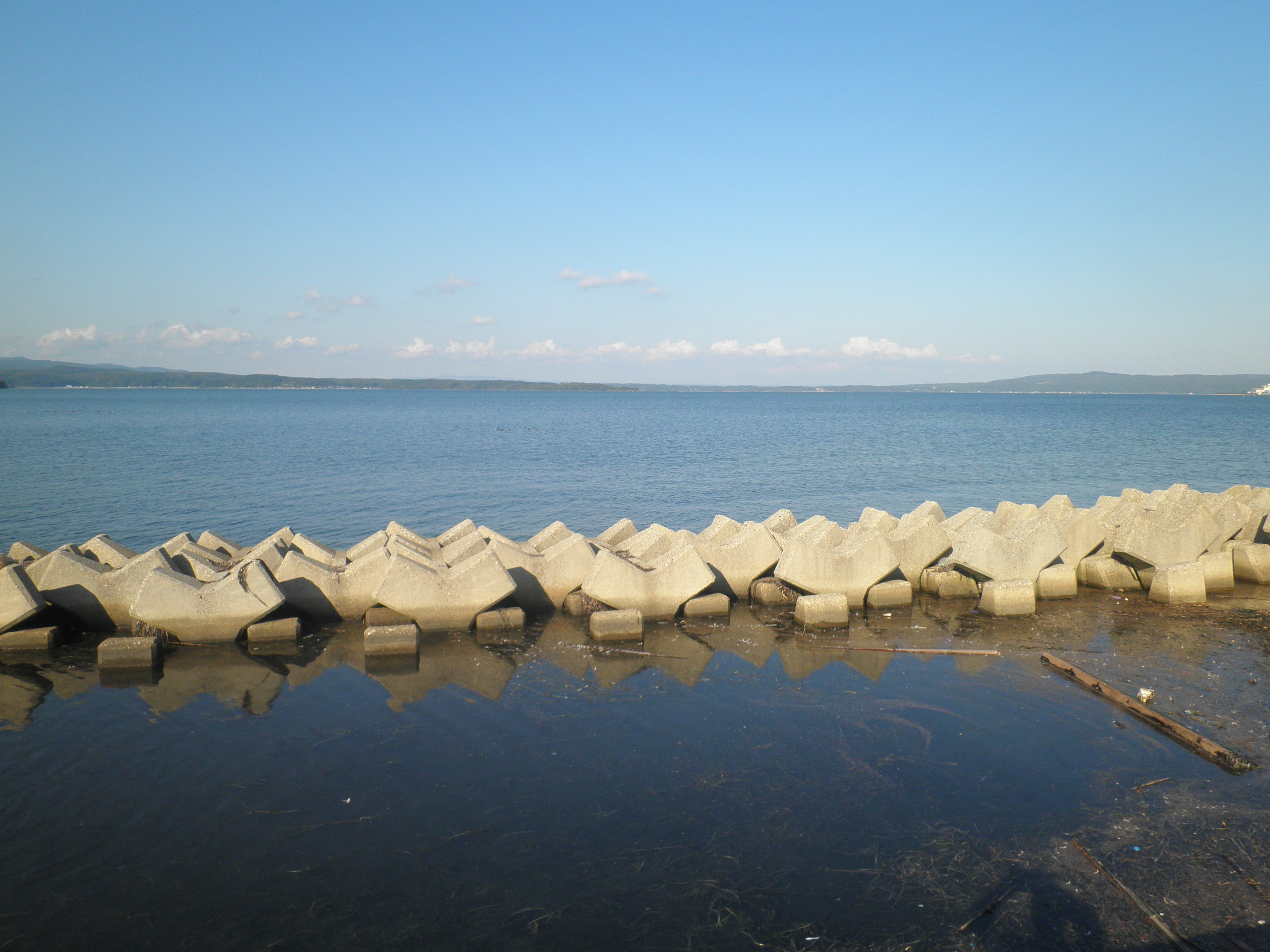 87 白浜 (石川県七尾市白浜町 付近 ) 地図から見て予想していたが、コンクリートの壁が続く海岸でした、戦中のコメ増産のために行ったと、散歩中の人に聞きました。能登島が前方にあり波静かな湾で、綺麗な浜を残してほしかったと思いました。