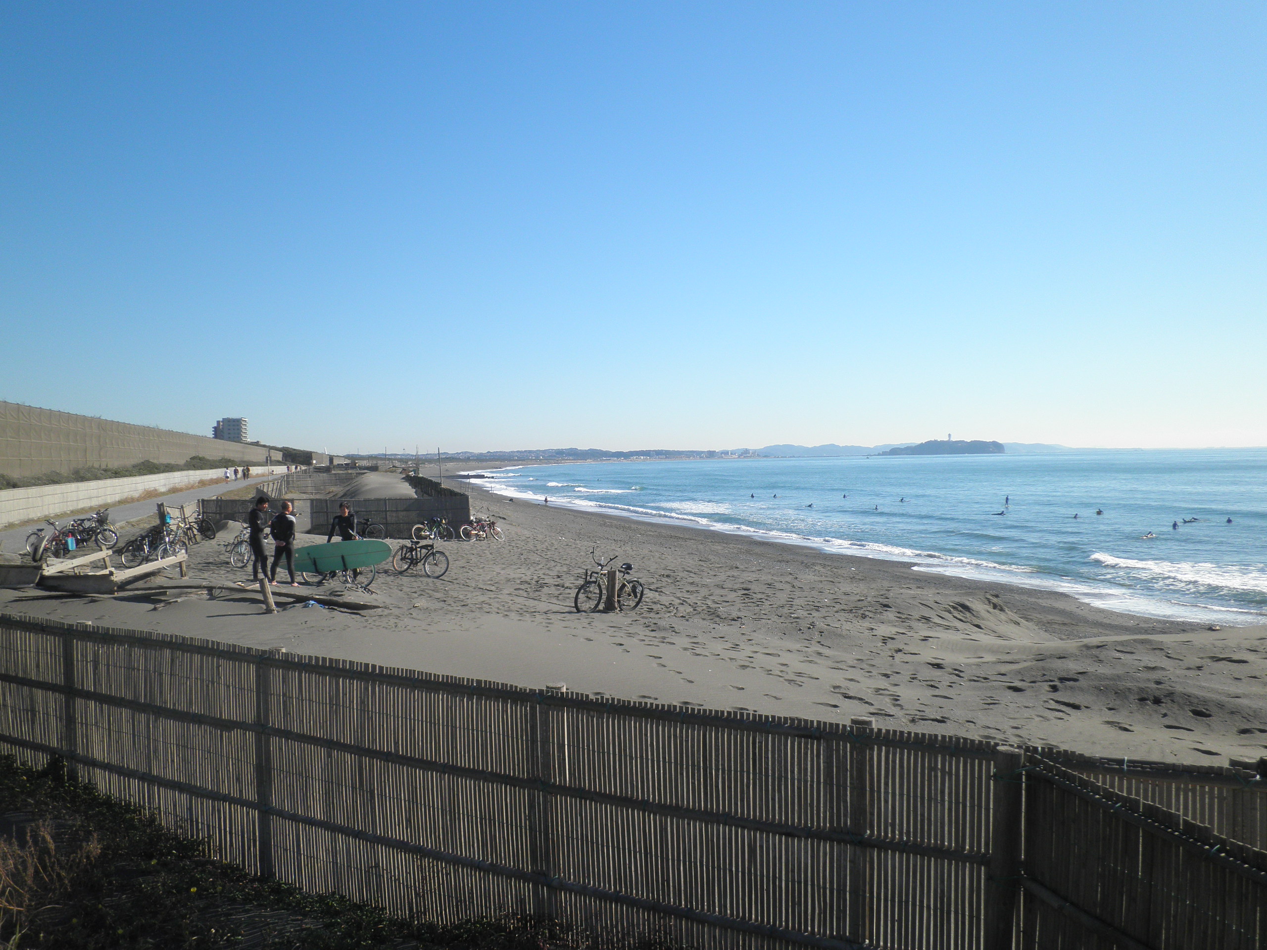 89 白浜町 (神奈川県茅ヶ崎市白浜町 付近 ) 伊豆の白浜から82km。烏帽子岩と江の島が目印なのだろう。その中間にあります。台風の被害で削られた砂浜を修復していました。上段画像前方が江の島、下段画像の沖の岩が烏帽子岩です。