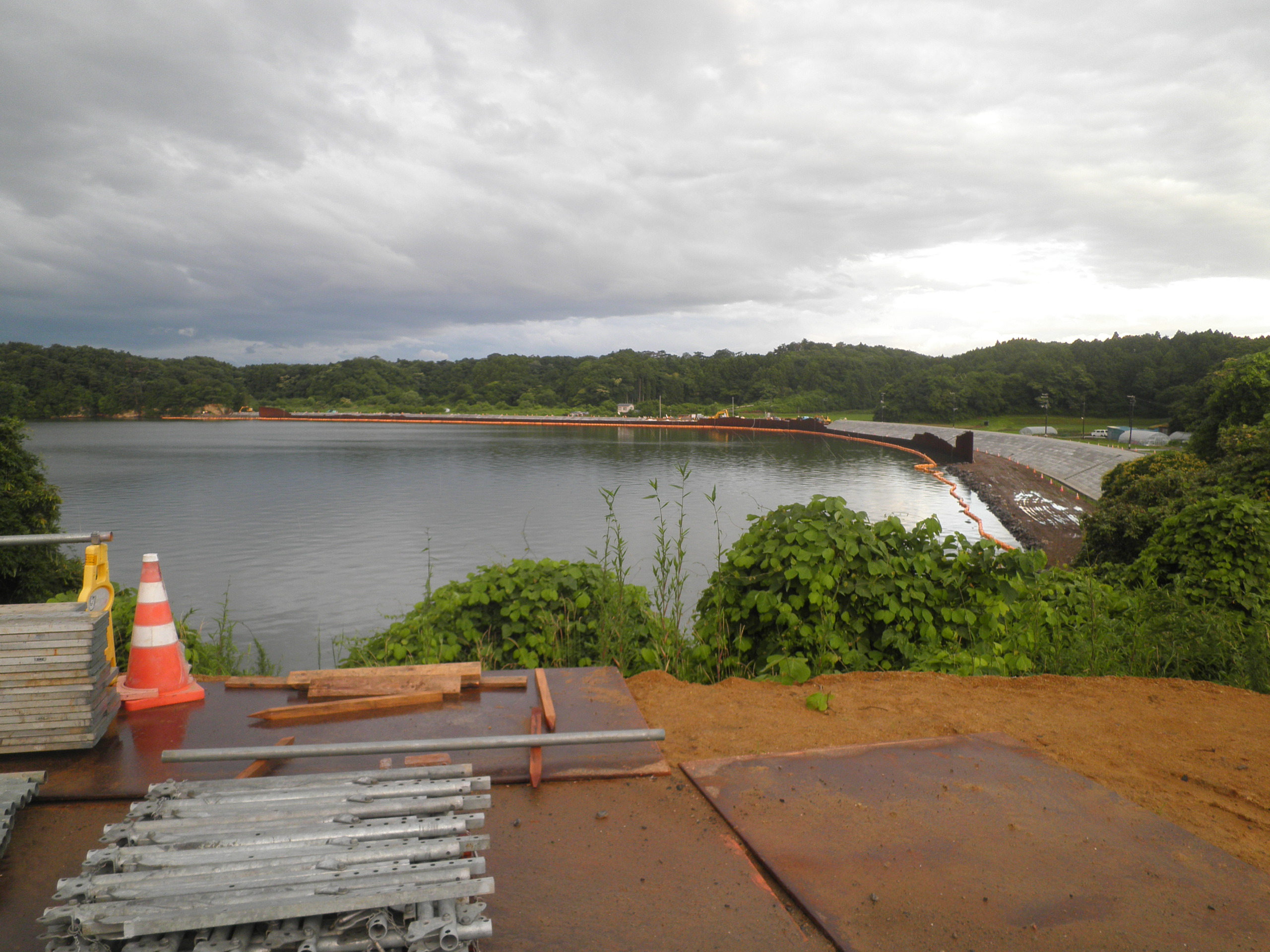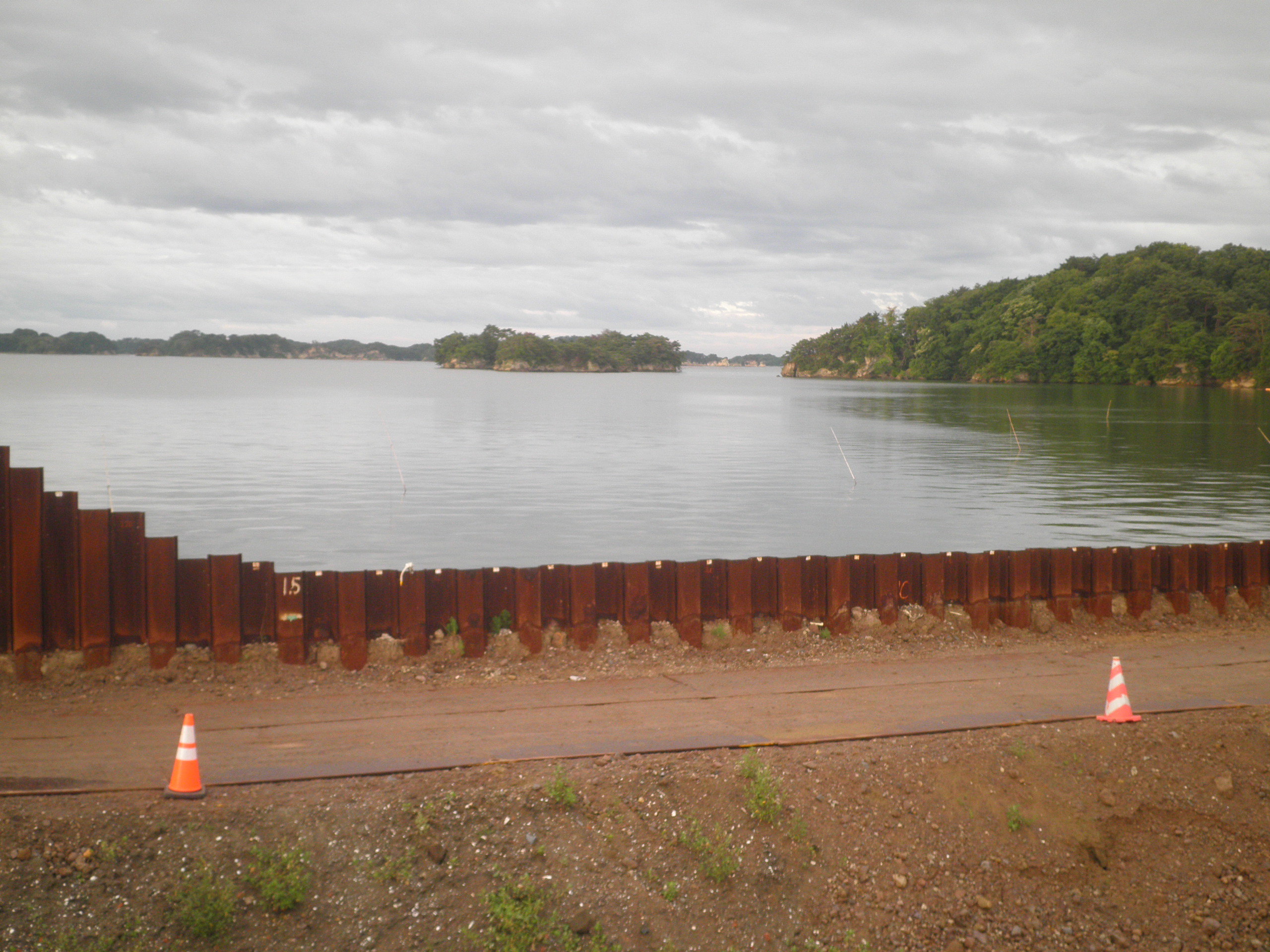 94 白浜島 (宮城県松島町手樽 付近 ) 中央前方の小島は小白浜島と白浜島が重なって見えています。下段画像は白浜島近くの大浜です。付近の人は泥浜といっていましたので、白浜と名づけできなかったのでしょう。付近は防潮の工事中でした。