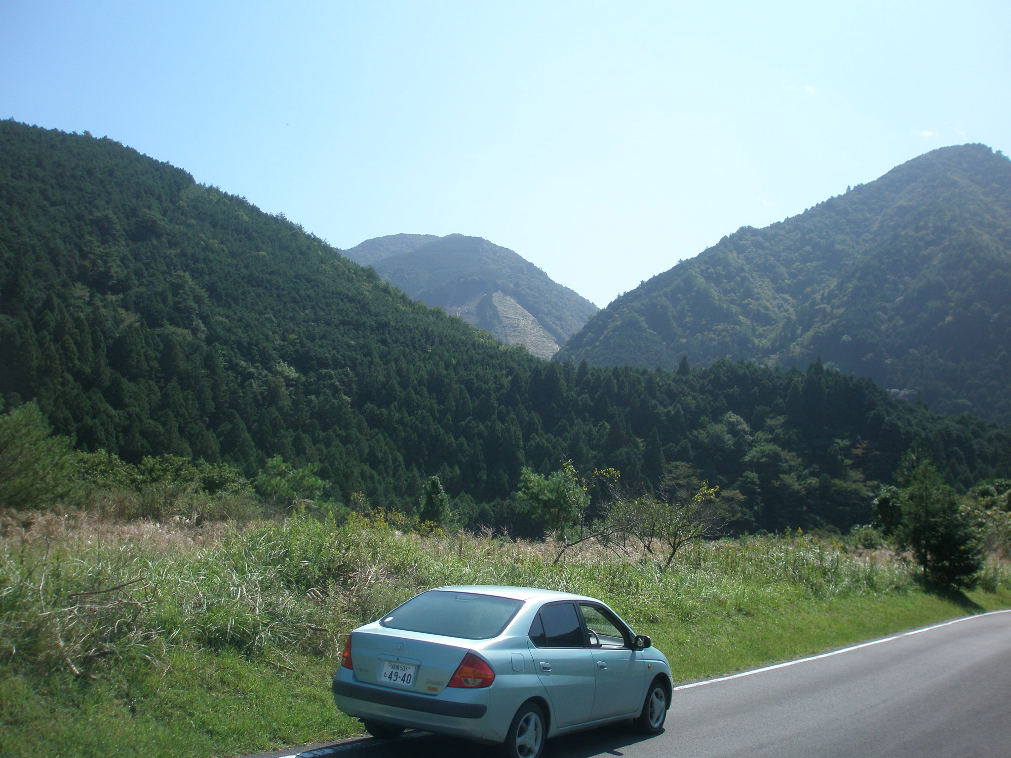 34 高尾山(和歌山県田辺市木守付近) 中央谷間の奥に見える山が高尾山です。落石の多い林道で、パンクした思い出が残ります。