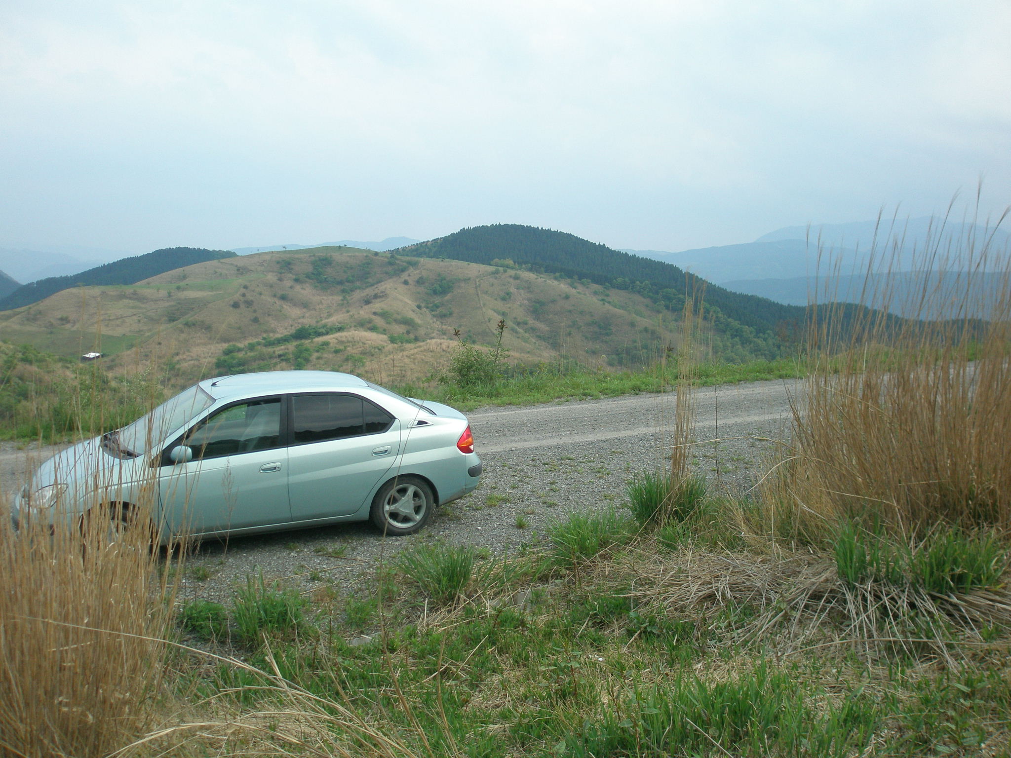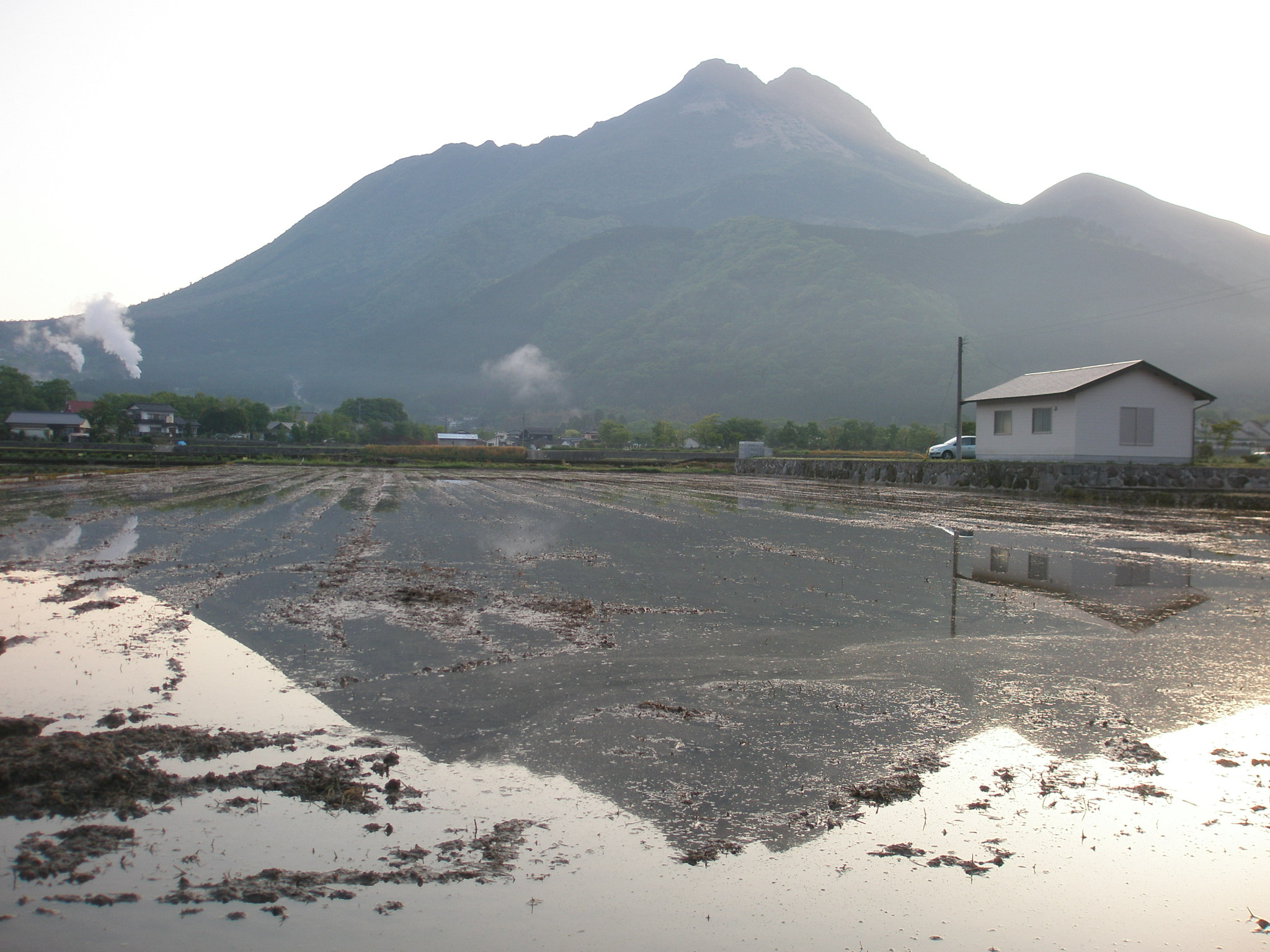 9 高尾山(大分県由布市湯布院町川西) 中央茶色の山の右奥の緑の山が高尾山です。宇佐の鷹取山を経て山口の藤尾山に結ばれていて、宇佐からの海の道を指し遺したように思います。下段は湯布院の由布岳です。