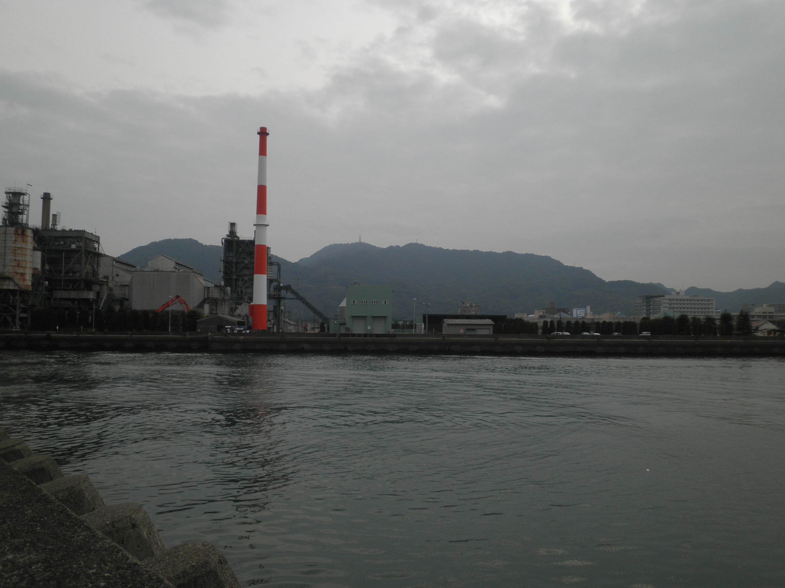 44 竜王山 (広島県三原市沖浦 付近 ) 煙突の右のアンテナがある山です。三原市の港に近いが、展望台からは瀬戸内海の方が良く見えます。尾道水道への道案内のようです。