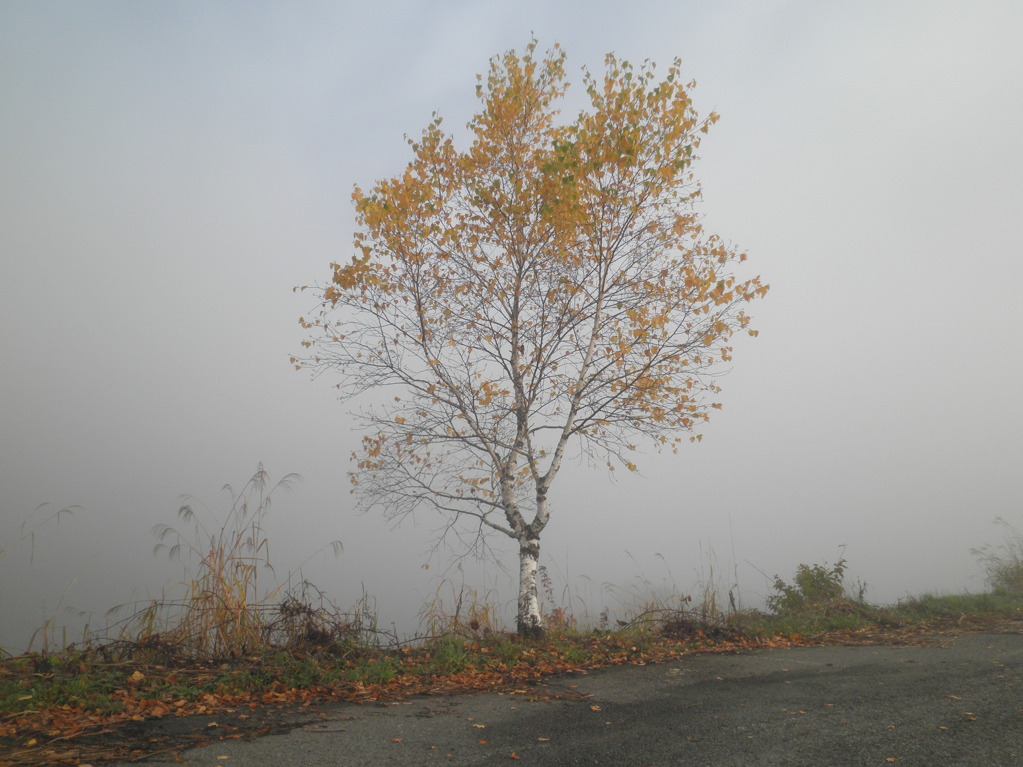 42 高登山(長野県飛騨市河合町元田 付近 )スキー場の頂上に行けば見えるというので、リフトの下の管理道路を登った。霧は上から晴れるので、霧の上に高登山が見えた。それでも霧が晴れるまで、駐車場でずいぶん待った。中央前方のとんがり山です。