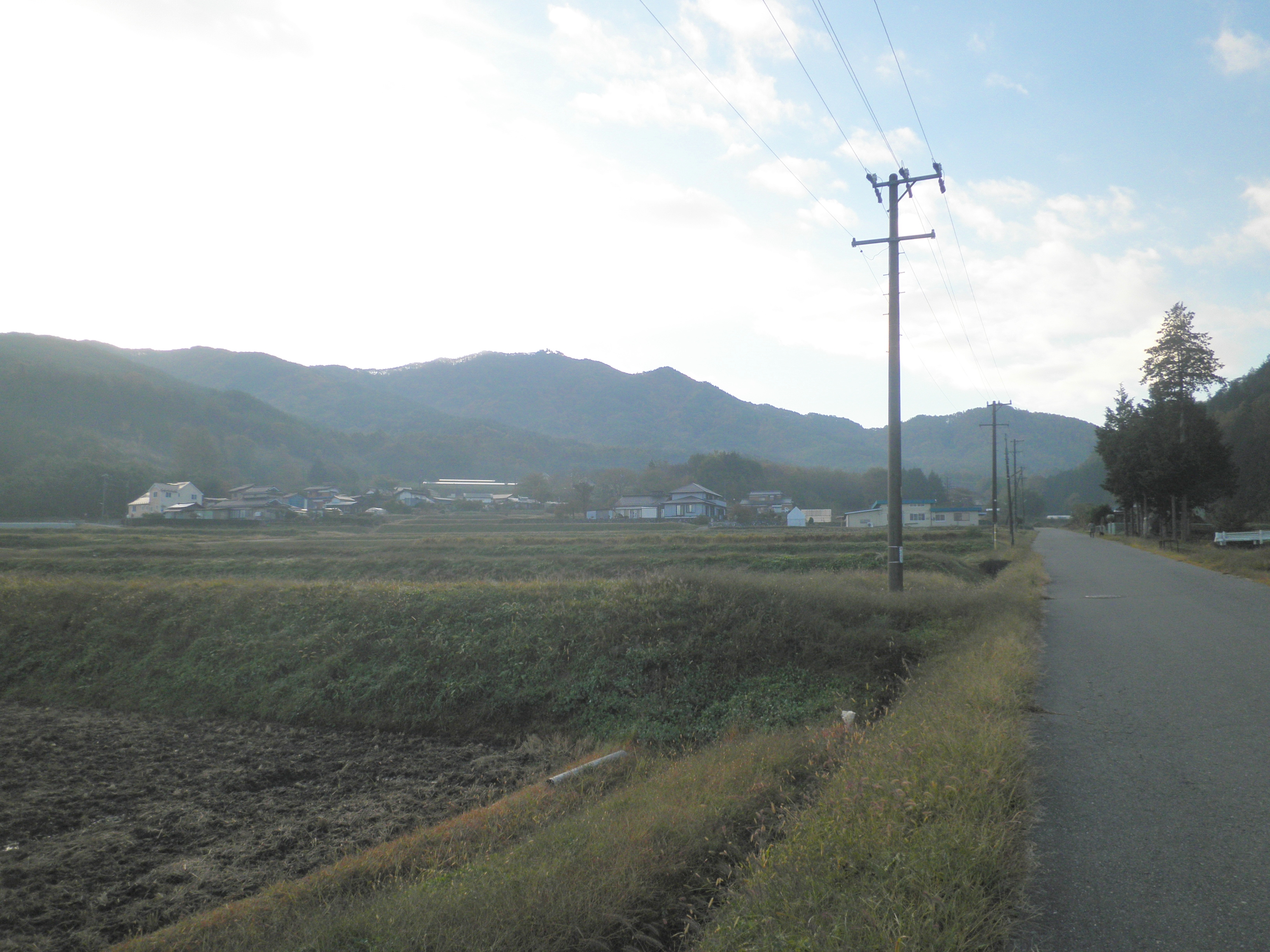 43 高烏谷山(たかずやさん) (長野県伊那市富県 付近 )同じ伊那谷の豊丘村にある高鳥谷山と対になっていると思われます。結んだ先が諏訪大社春宮付近を指し示しているので、日本武尊東征時には、春宮はあったのかもしれない。前方やや左の山で、二つのピークがある。
