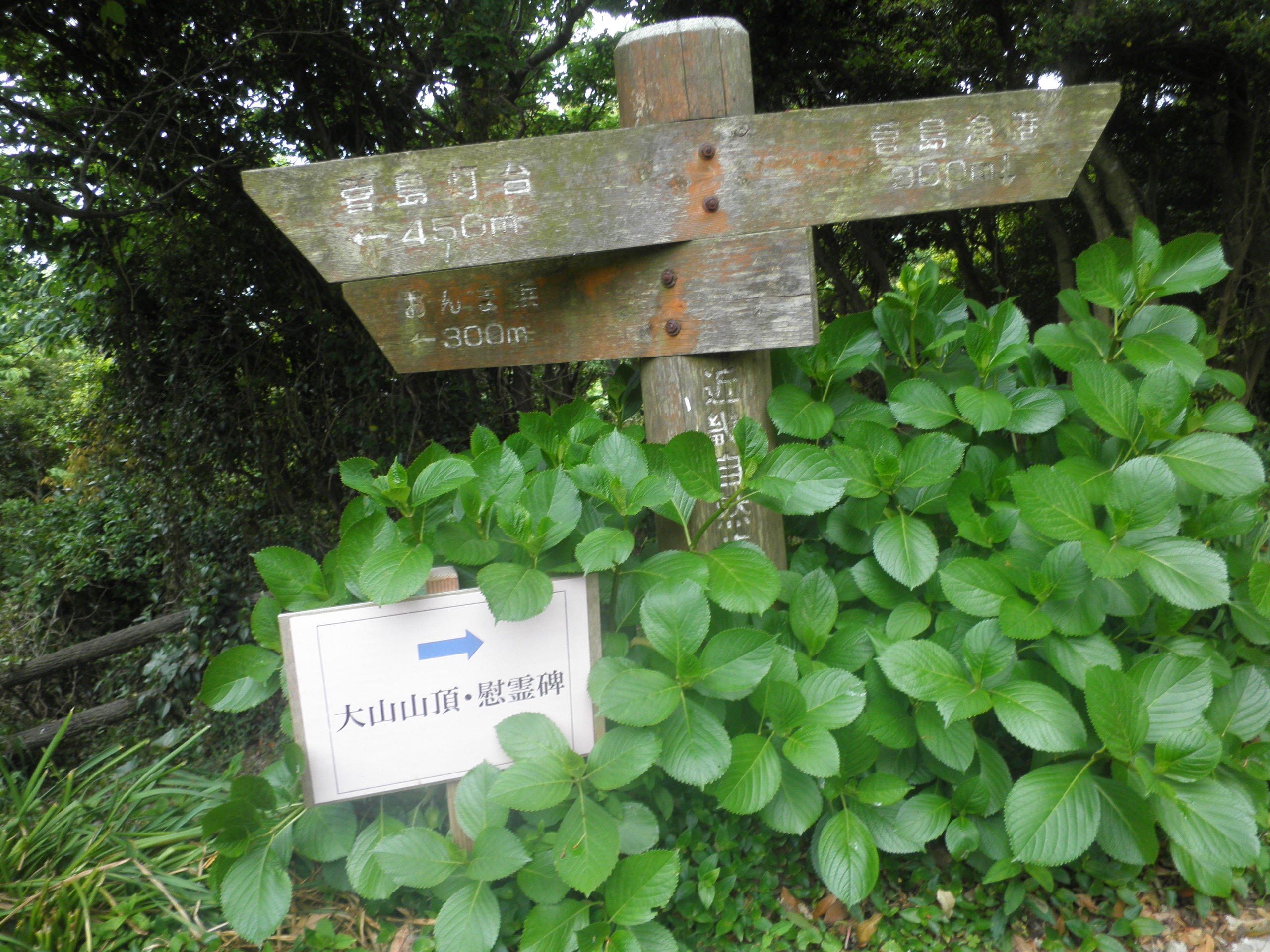 23 大山 (三重県鳥羽市菅島 付近) この島には長崎鼻もあります。神奈川県伊勢原市の大山から高千穂峰に続いていて、西日本の南側の形をたどっています。その先は、魏志倭人伝に登場する中国大陸の東冶に続いていると思われます。慰霊碑は自衛隊機が墜落した事故の慰霊です。