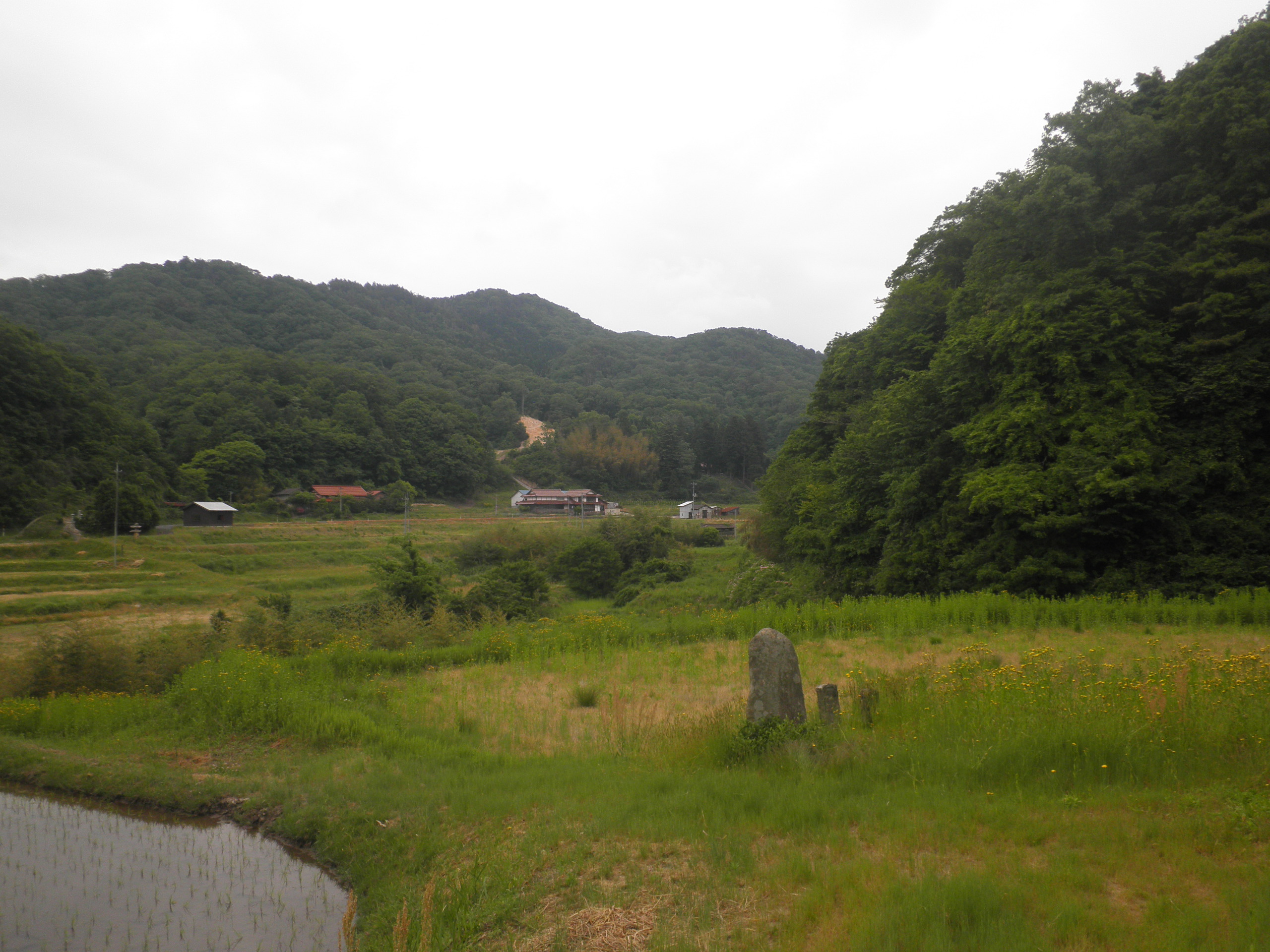 28 大山(だいせん) (島根県雲南市大東町塩田 付近) 上段画像はようやく山頂部が見える場所を探した位置です。前方の二つの山の鞍部にあります。古い石塔が大山の方向を向いてありました。私と同じように大山が見える場所を探して見つけた感動から石塔を置いたのでしょう。