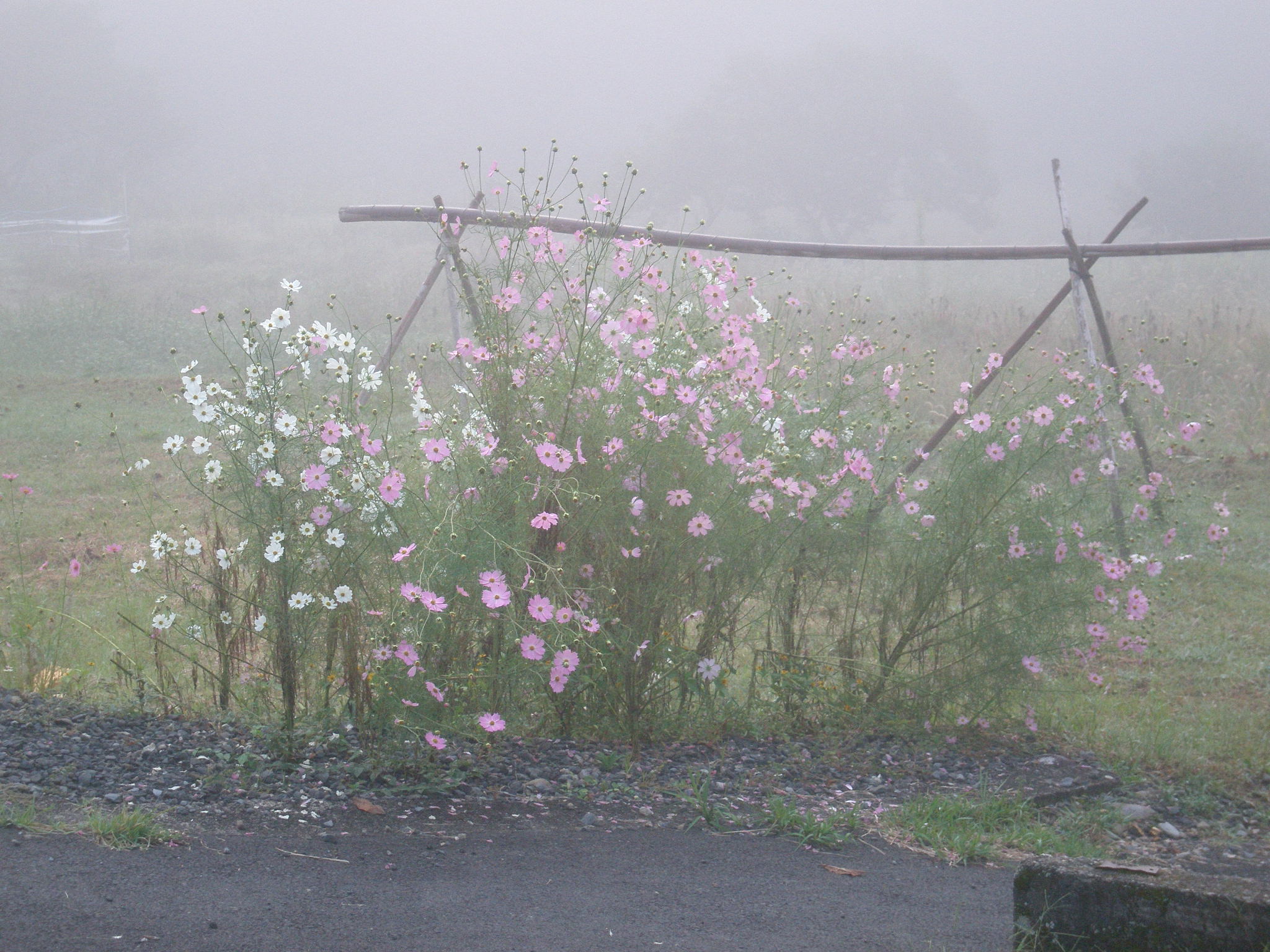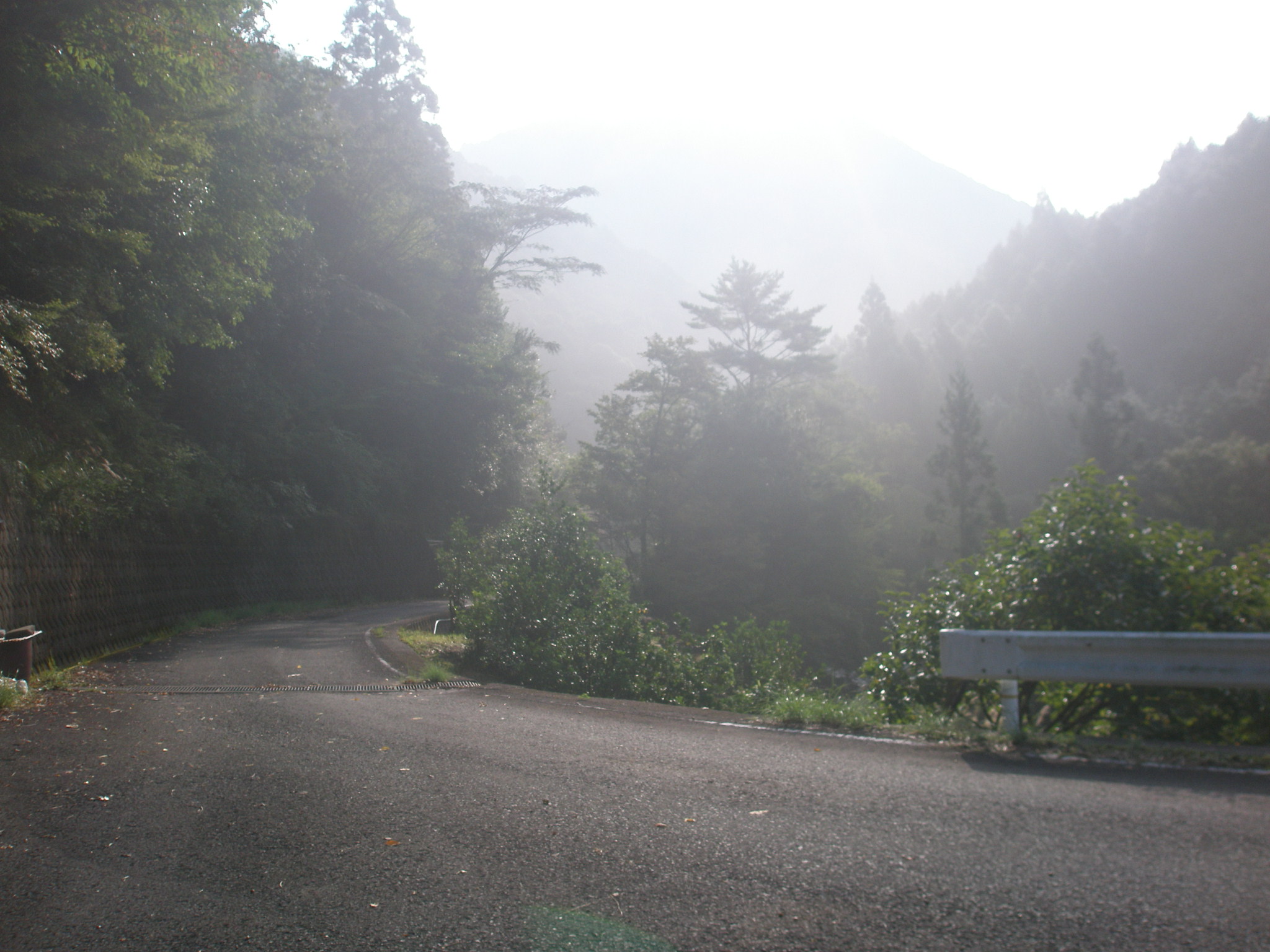 109 椿尾山 朝早く中辺路から林道をかなり入った。でも家はあった。霧がかかる正面の山。下段は早朝の近露付近です。