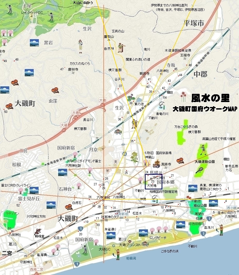 は富士が見える地点。赤点、番号は道祖神など石仏の位置です。