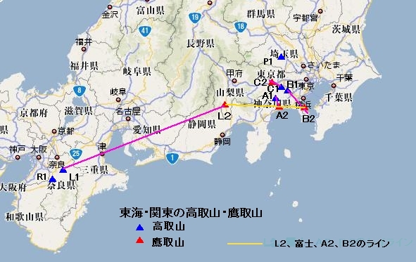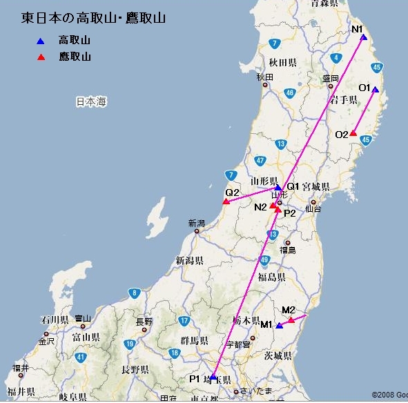 日本武尊の東征 (下図参照) 奈良の南にある高取山から、一気に身延の鷹取山にベクトルが伸びています。富士の西に位置しています。相模の鷹取山も富士を意識した位置にあり、富士山へのこだわりを感じます。 日本武尊の東征は火難あり、ロマンスあり、姫の入水ありの波乱の東征が伝えられています。日本を隈なくの東征であることは、まだ知られていなかった神武東征のベクトル発見でもおしはかることができます。多くの伝承が各地に残るのも納得できるのです。 ![]() 日立から船に乗り北上して、八戸から南下した(下図参照) 東京湾を渡り、房総に上陸した東征軍は東関東を北上して、常陸大宮にベクトルを残しています。日立の海岸方向に向かっています。ここから先、北上のベクトルが無いことから、船で北上したのではないでしょうか。日立に尊が船から下りて戦勝祈願した伝説があります。八戸まで渡った後に南下した、壮大な足取りになっています。 一方、埼玉県越生町から一気に山形までベクトルが伸びているのは、厚木付近で分岐した隊ではないでしょうか。 ![]() 日本武尊は、分隊と山形で合流して日本海側にでた(下図参照) 北から南下してきた東征隊は、南から北上した隊と山形で合流して、山を越えて 新潟県の村上市方向に向かっています。 そこには「日本国」の名前の山があります。日本建国にふさわしく何か誇らしい気分です。このベクトルが東征最後の高取山・鷹取山です。 |