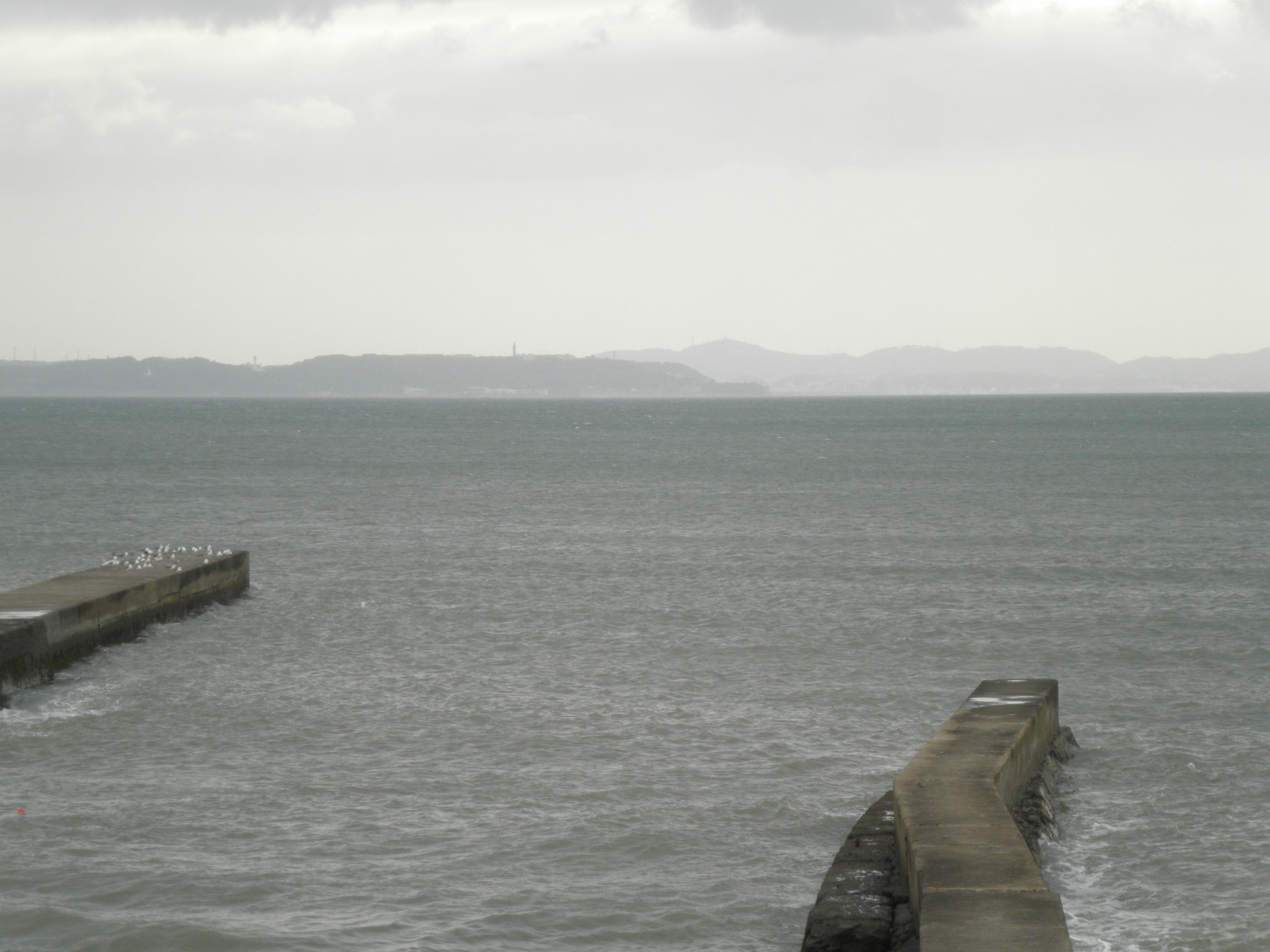 11 岩瀬海岸から見た三浦半島です。観音崎の灯台が見えます。その右側山陰が走水の港になります。吾妻神社から直線関係にあります。