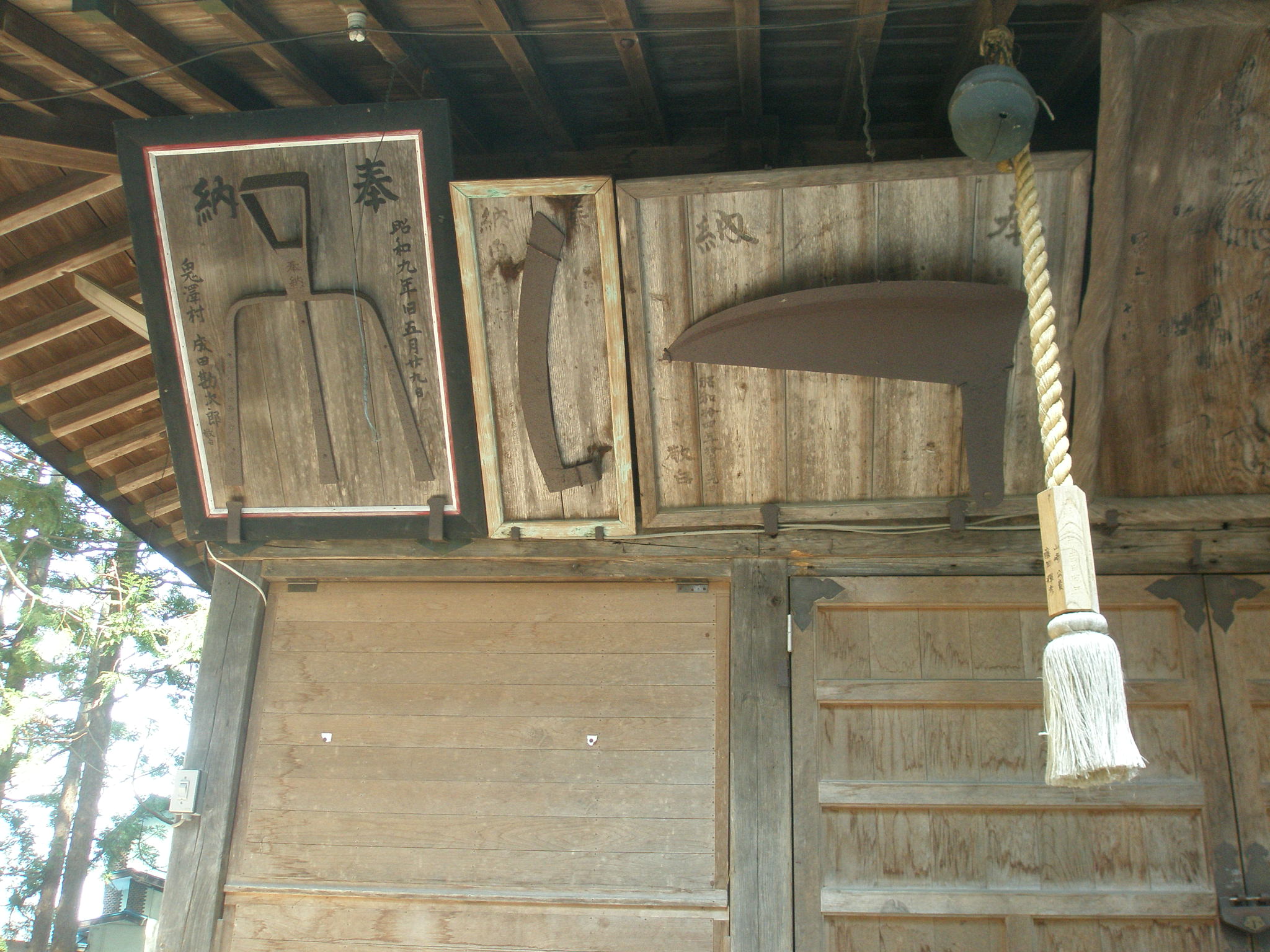 4 鬼神社に奉納された農具。上古、現れた鬼に農業に用水の必要を訴えると姿を消して、翌朝荒地には一筋の水が流れていた。